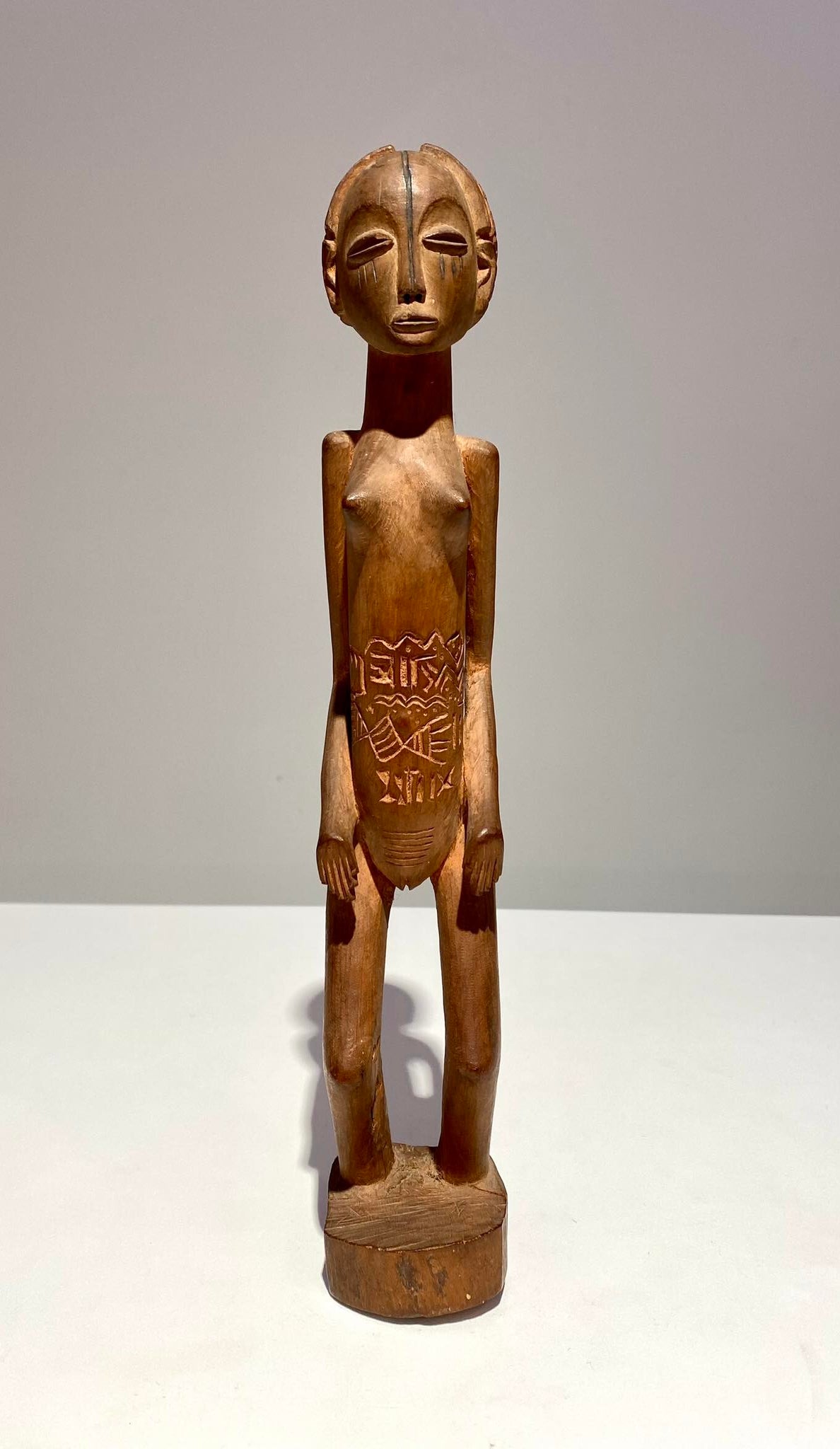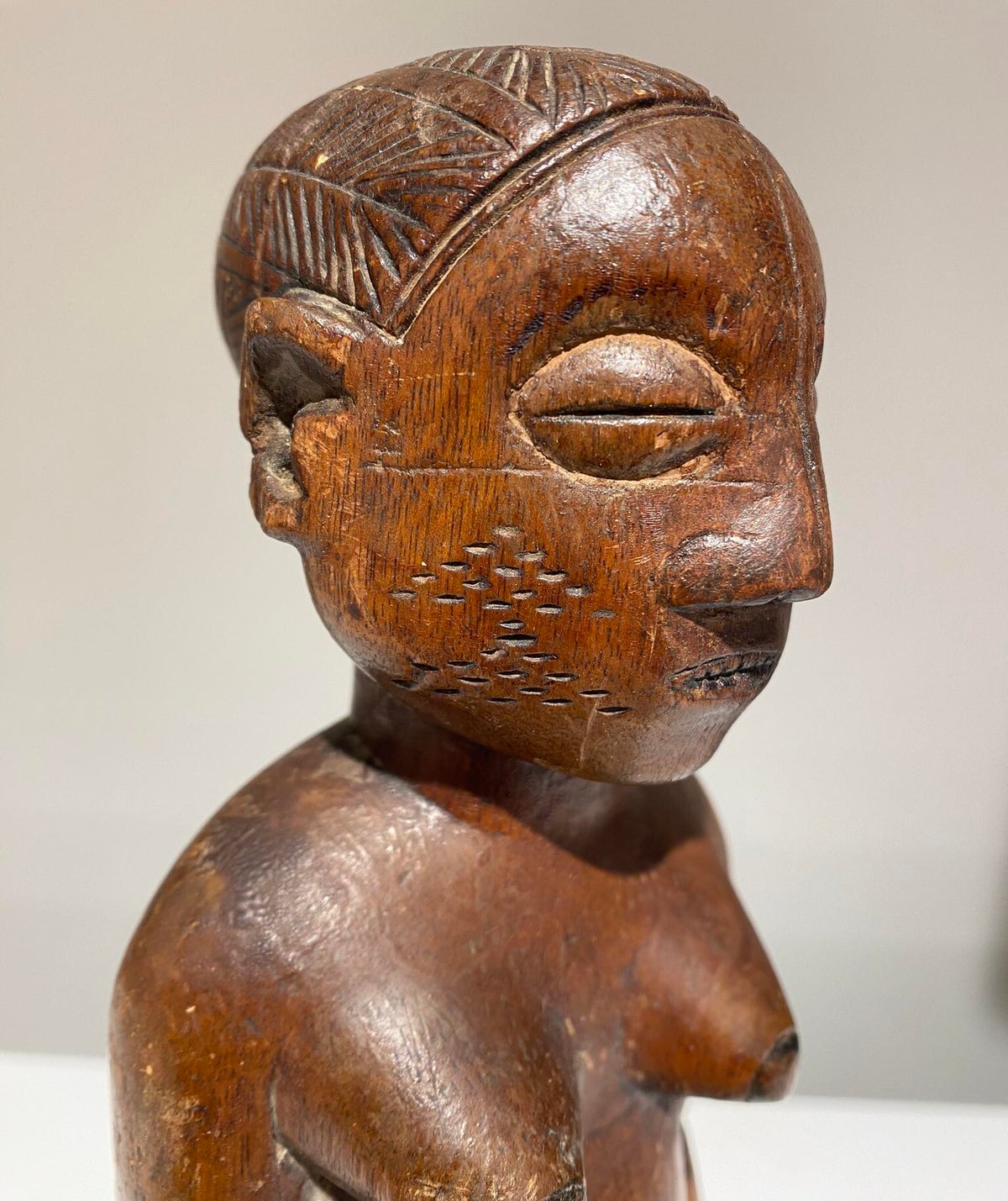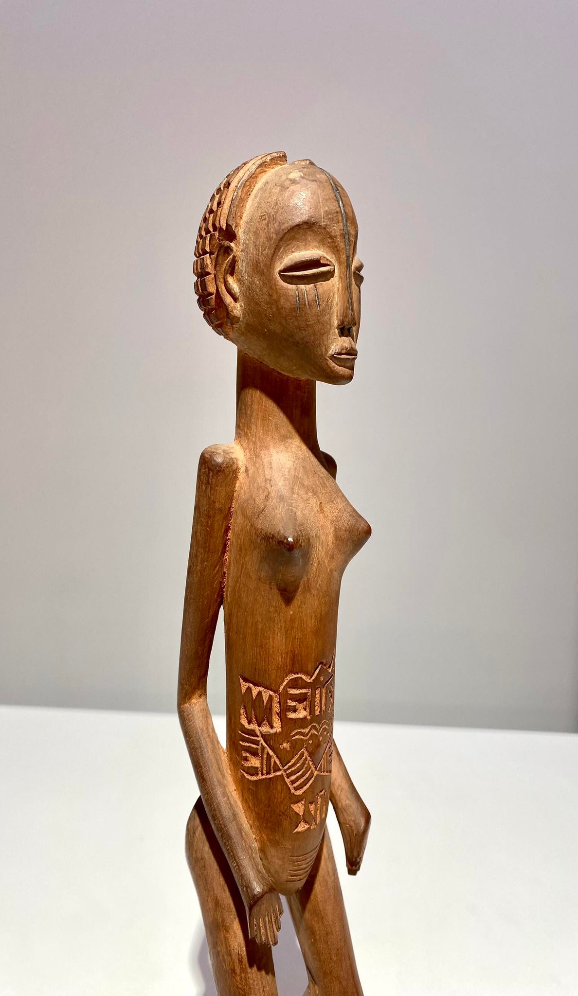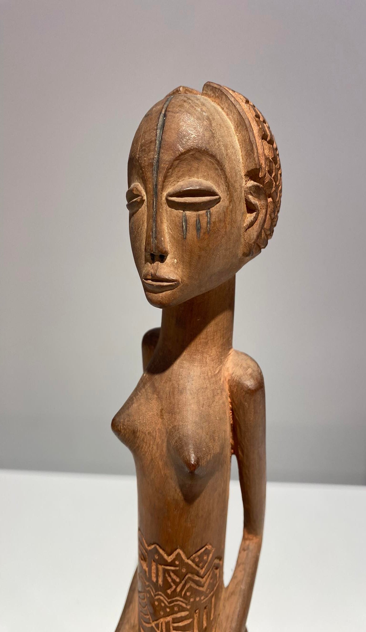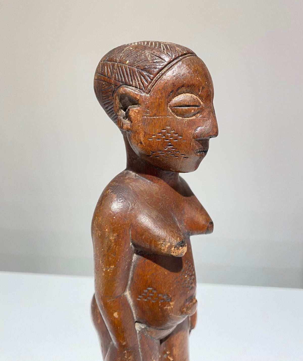 Refined Mangbetu female figurine, Democratic Republic of Congo. Red-brown patina and fine carved scarifications on torso. Late 19th century.