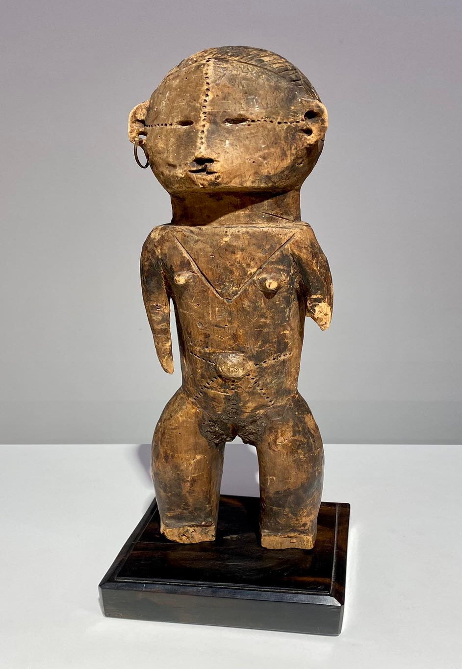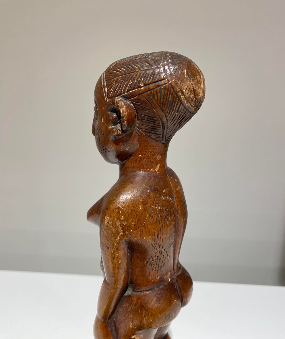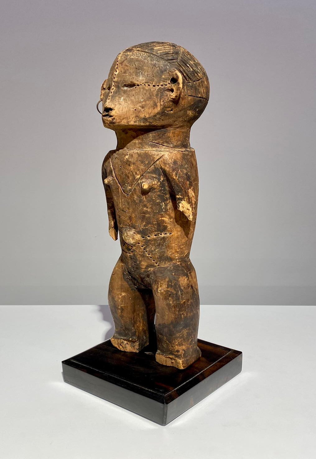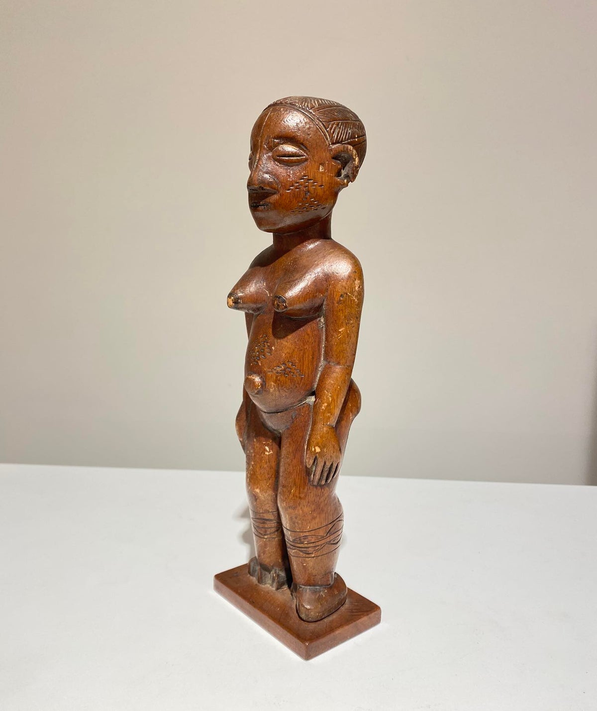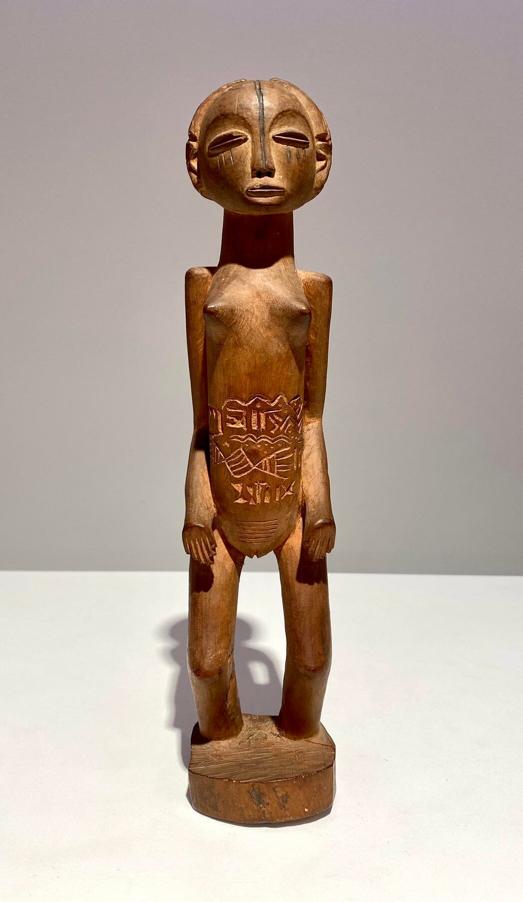 Refined Mangbetu female figurine, Democratic Republic of Congo. Red-brown patina and fine carved scarifications on torso. Late 19th century.