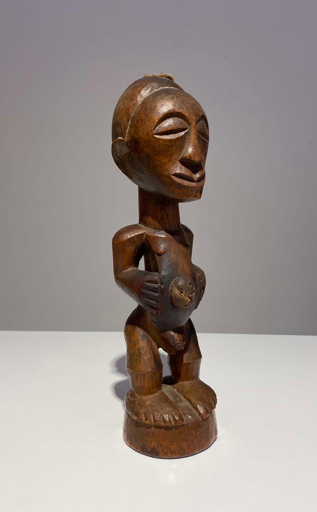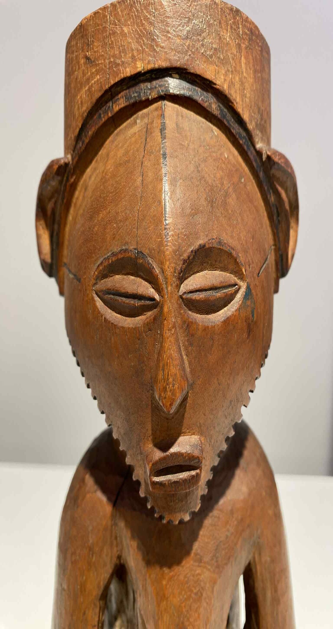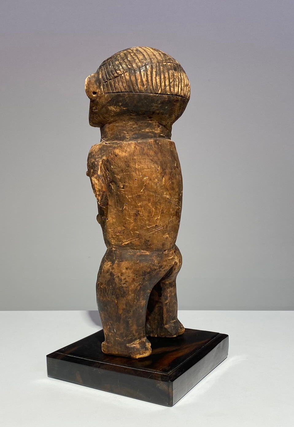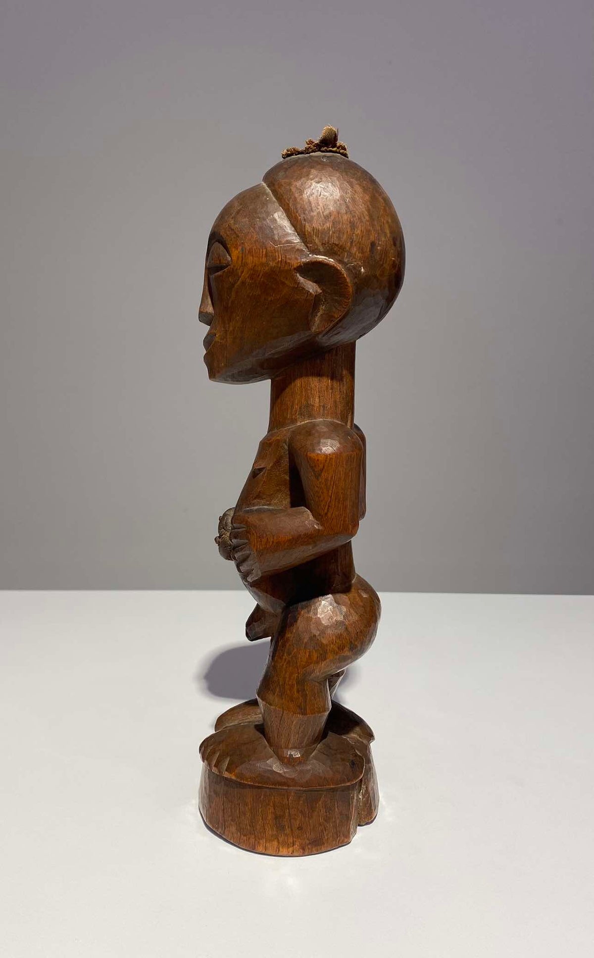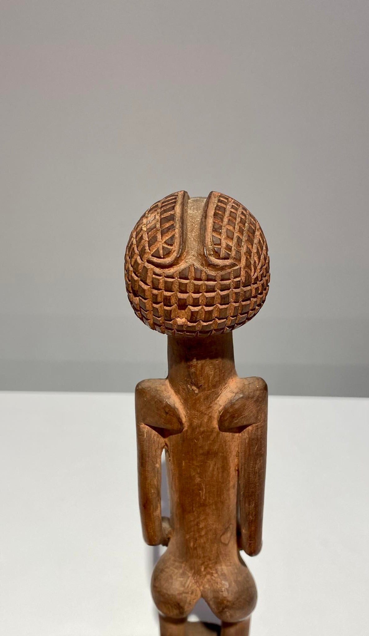 Refined Mangbetu female figurine, Democratic Republic of Congo. Red-brown patina and fine carved scarifications on torso. Late 19th century.