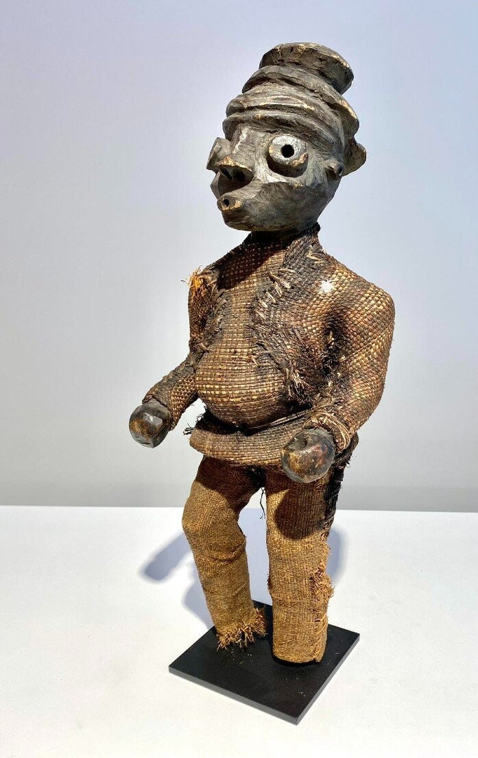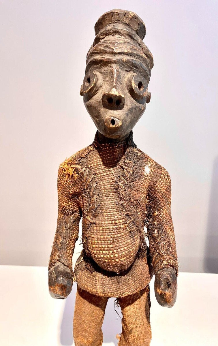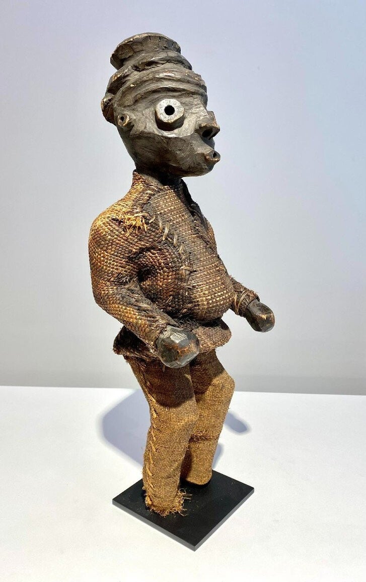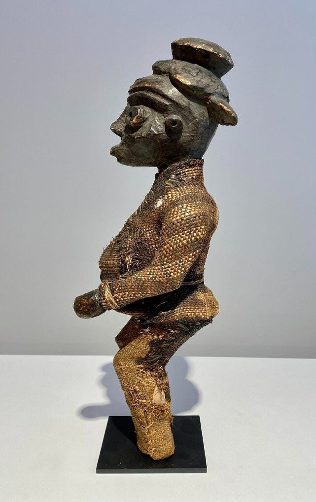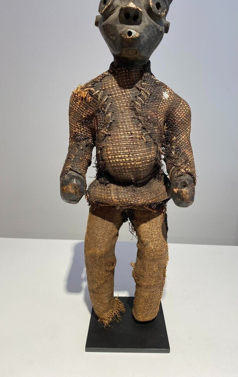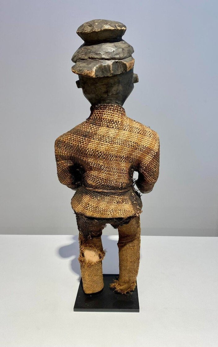 This statue still has the original raffia cloth. Beautiful original deep patina.
