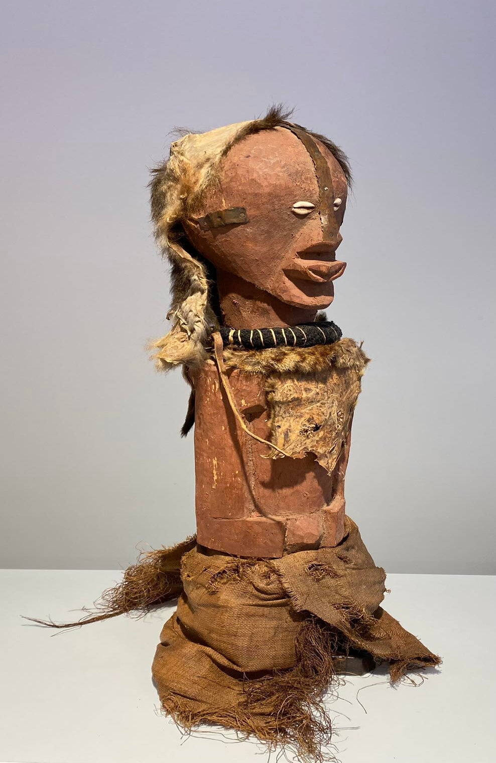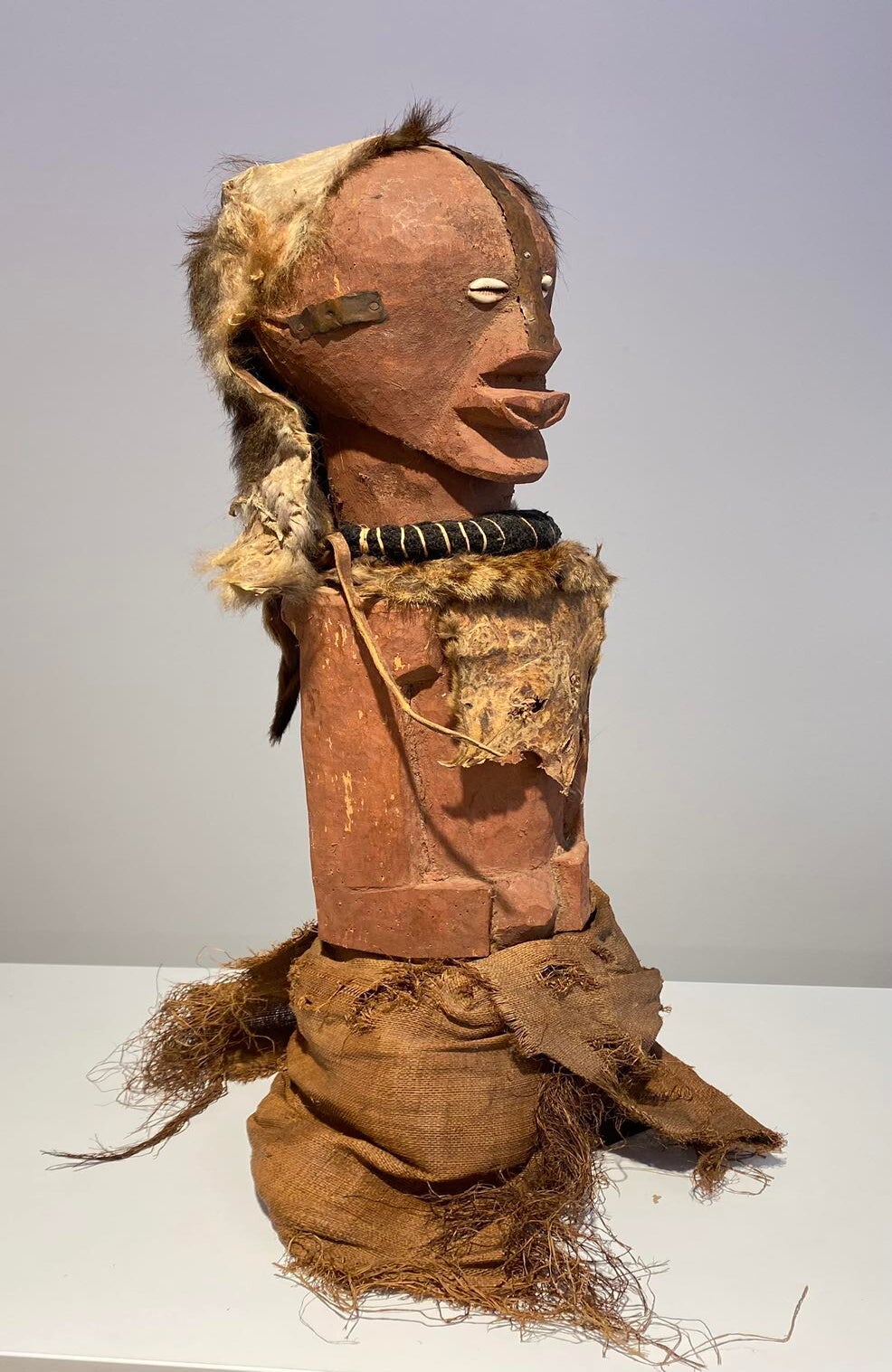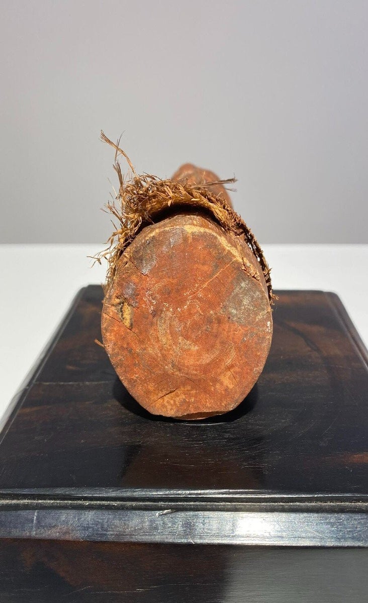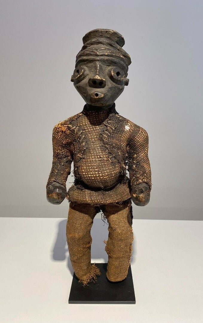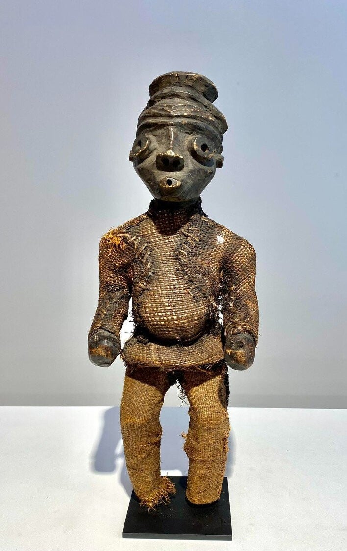 This statue still has the original raffia cloth. Beautiful original deep patina.