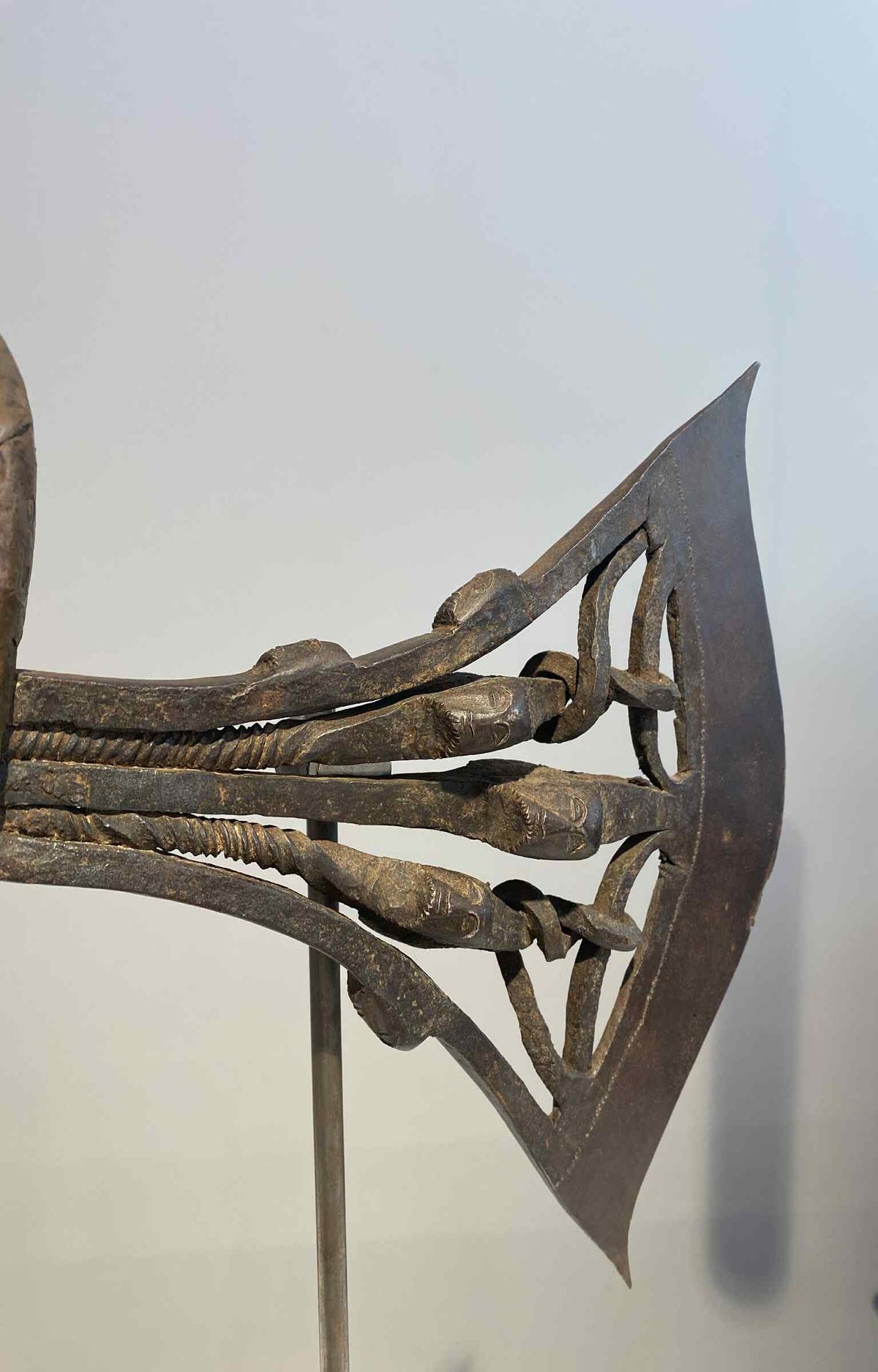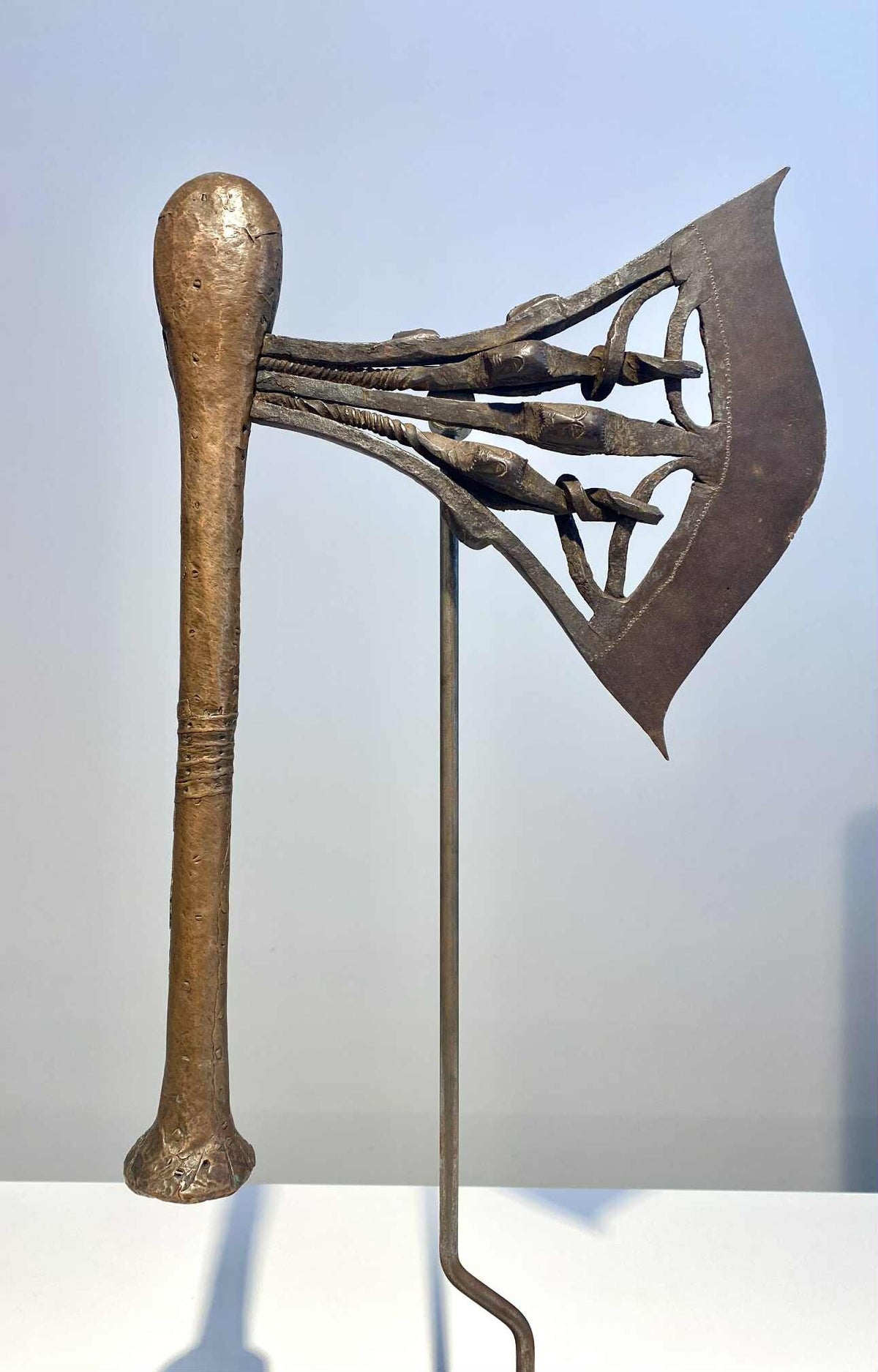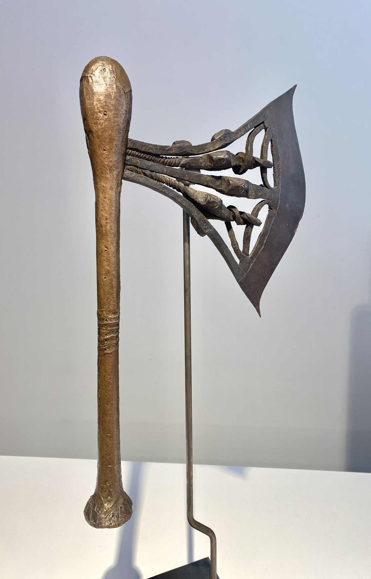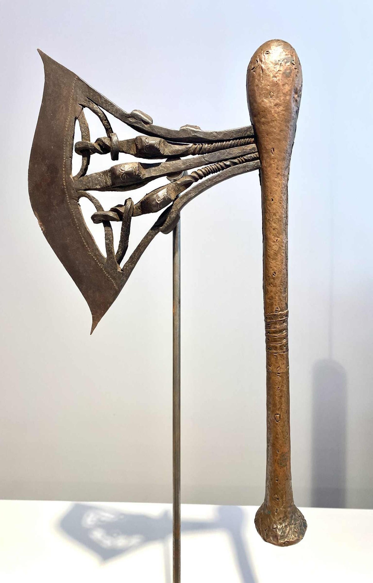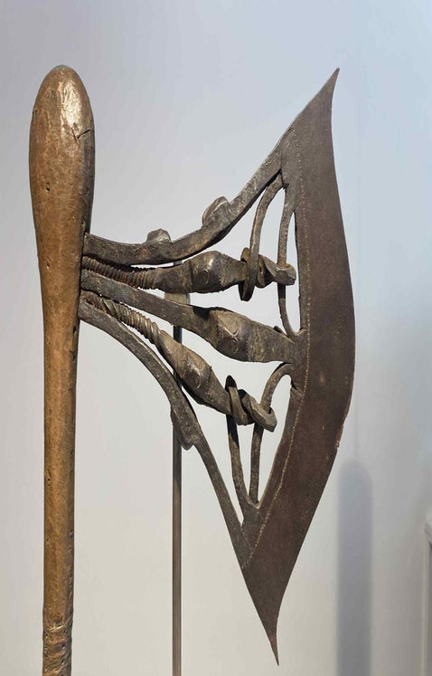 A very rare kilonda axe with 3 heads on the side of the blade which is very uncommon. On the axe blade are a total of 9 iron heads.
