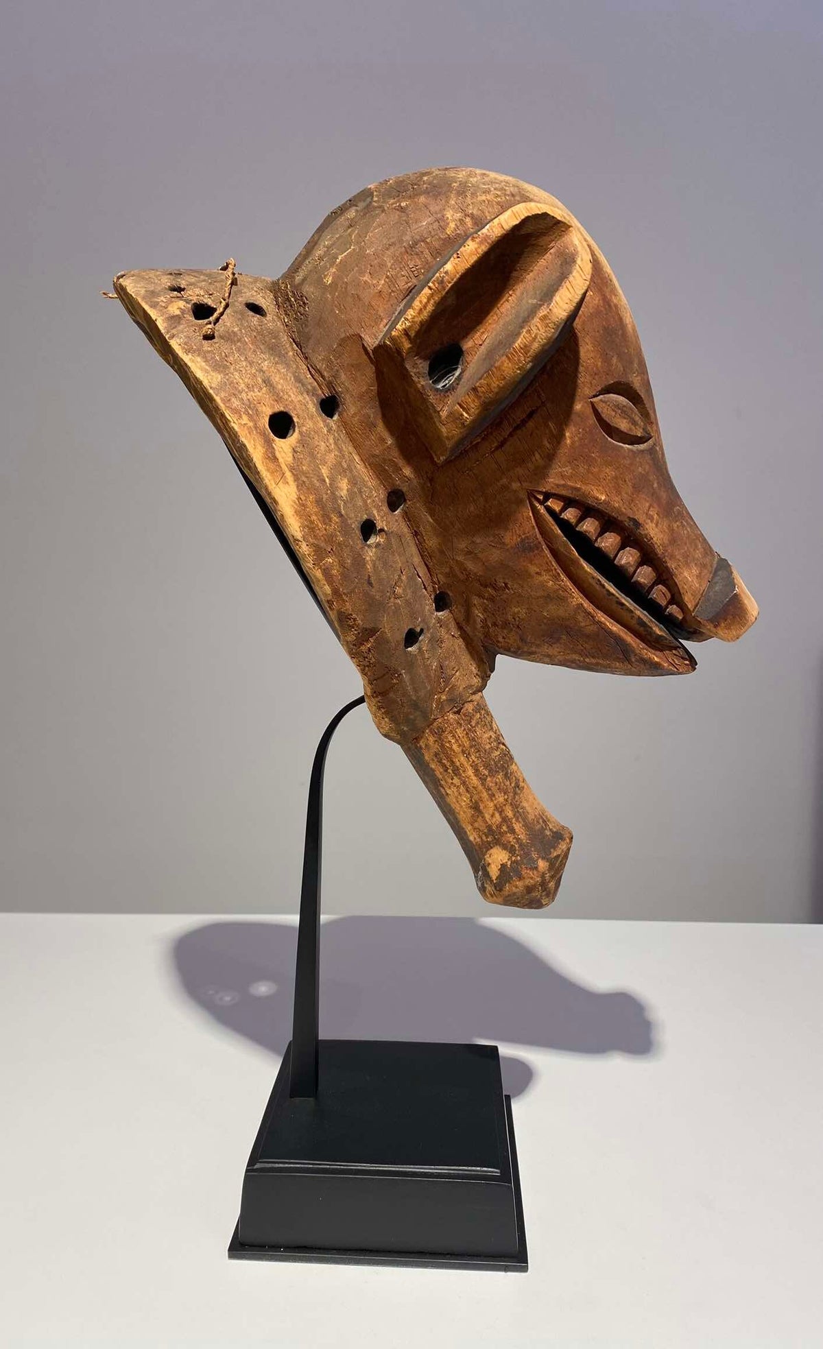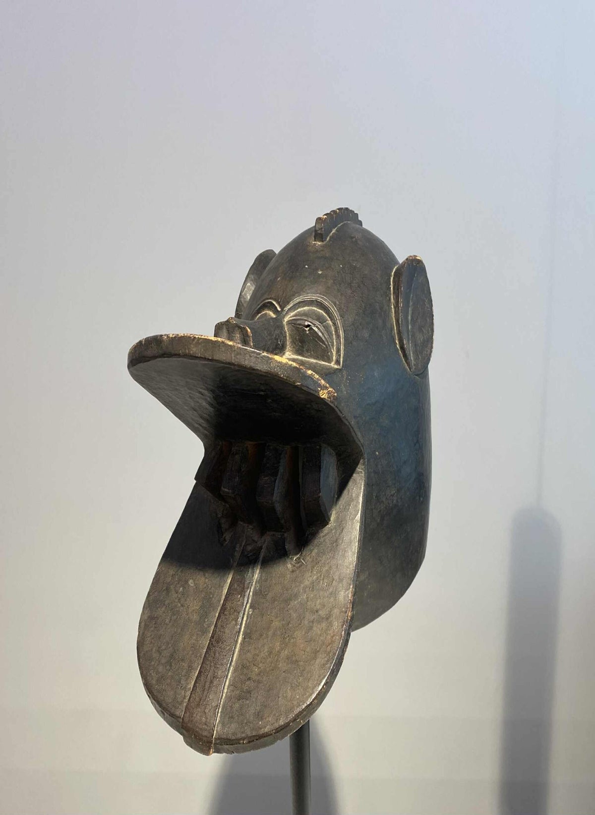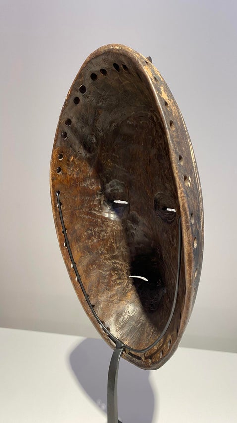 Animal masks like these with their visible teeth are quite agressive because they needed to protect the young boys against evil forces. When the boys are dancing with the masks, the handle was used to hold the mask.