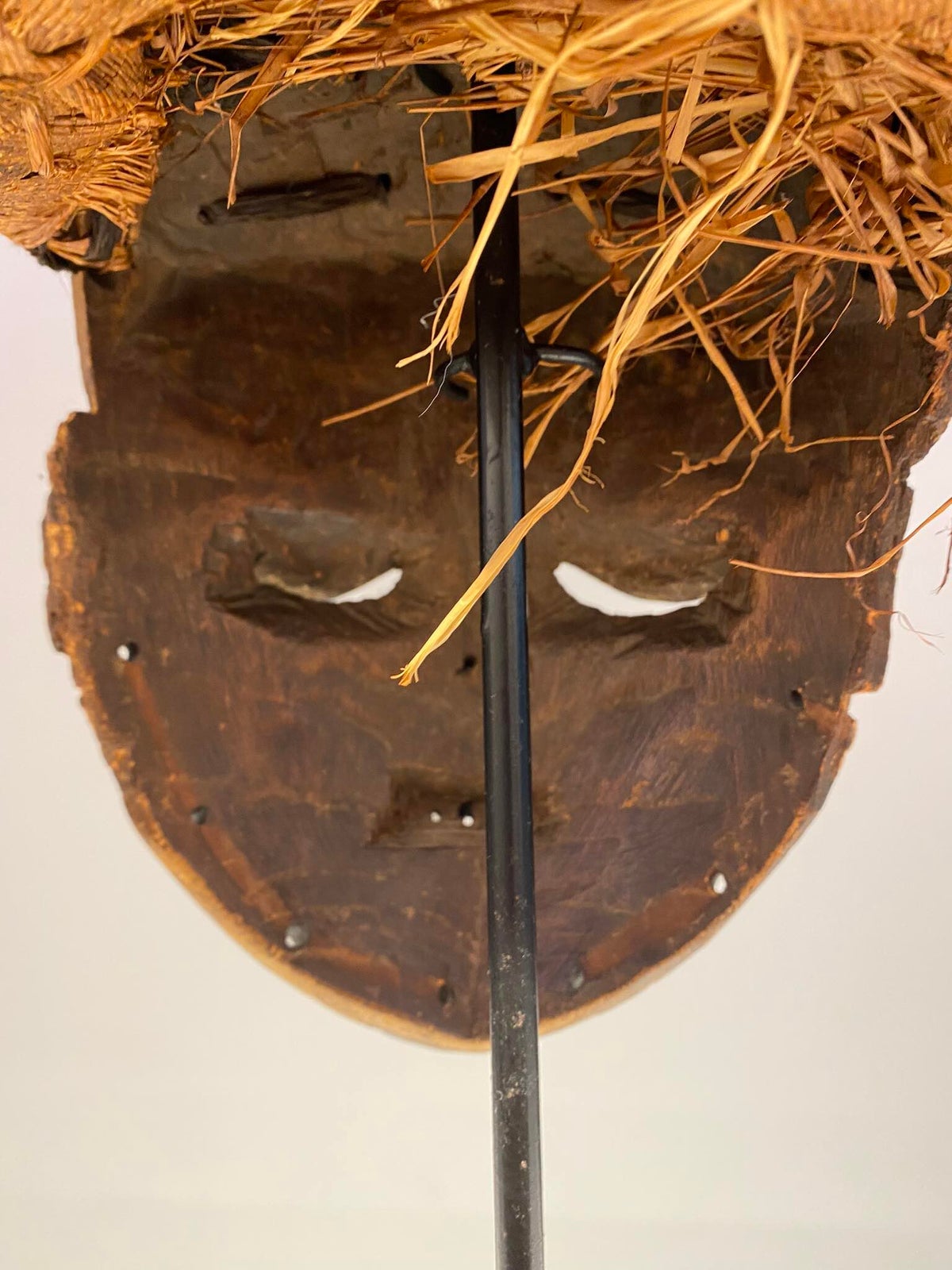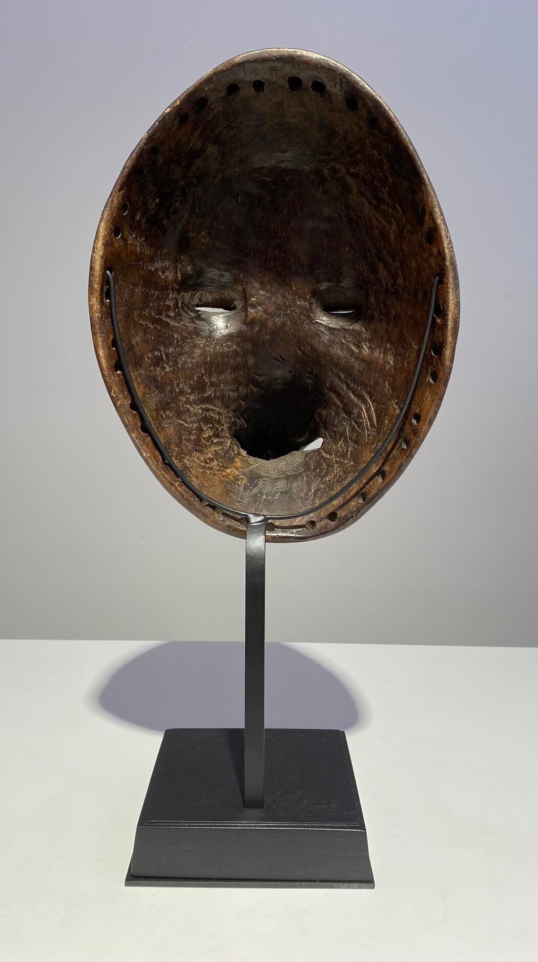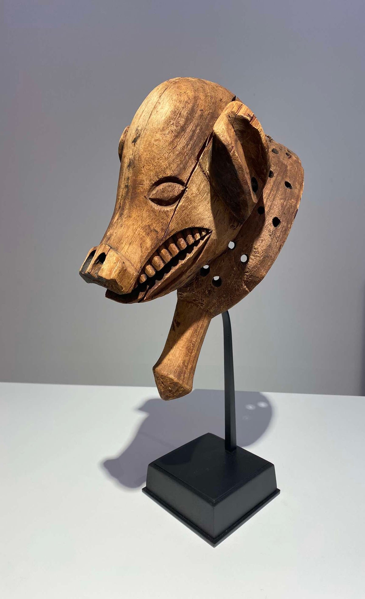 Animal masks like these with their visible teeth are quite agressive because they needed to protect the young boys against evil forces. When the boys are dancing with the masks, the handle was used to hold the mask.
