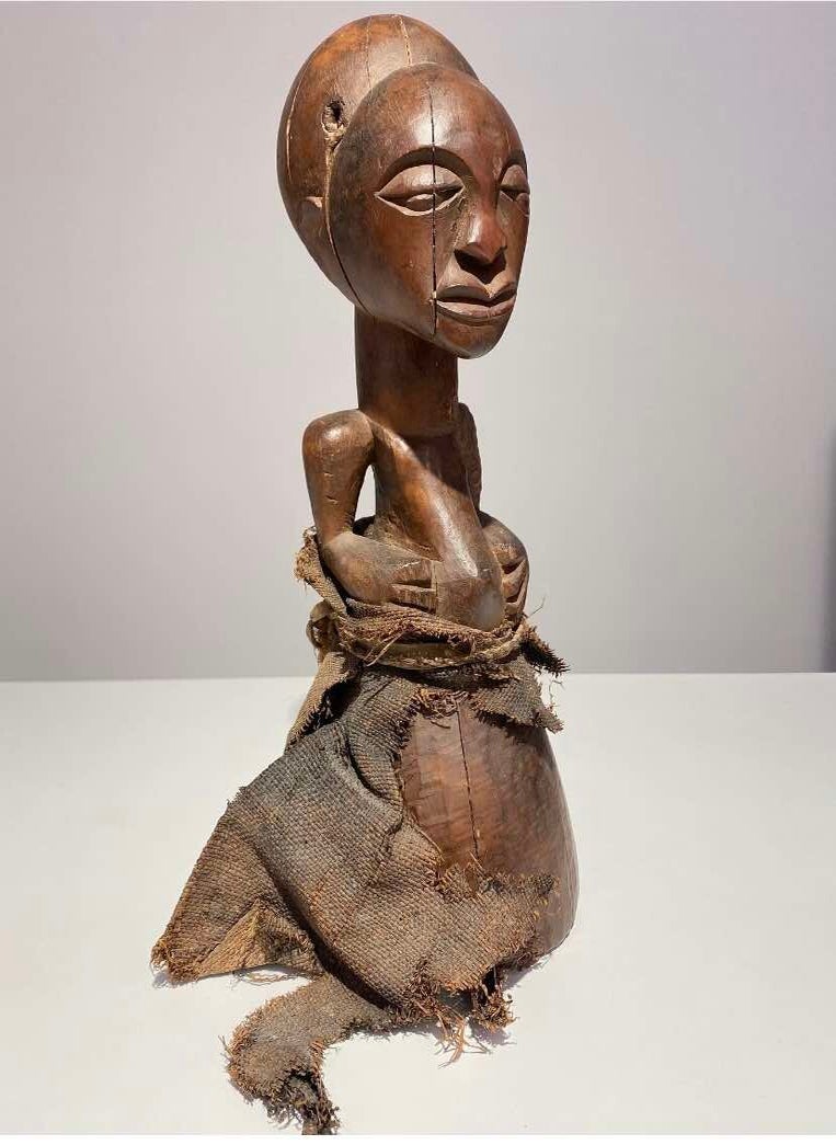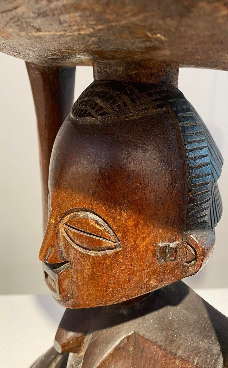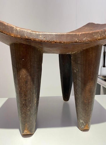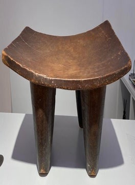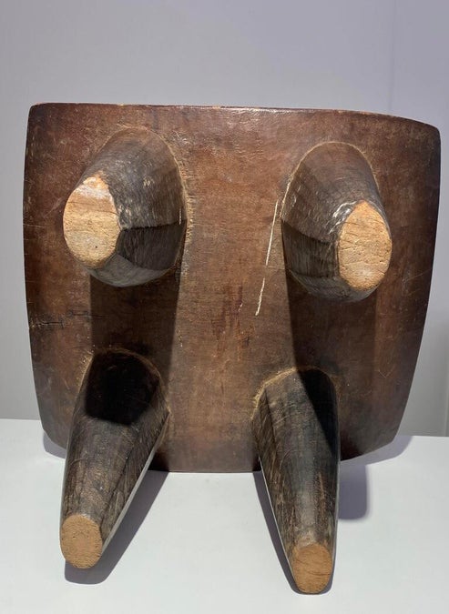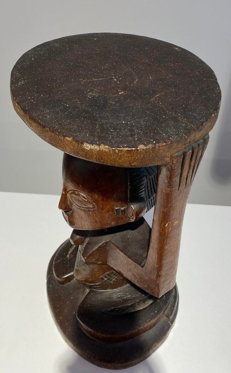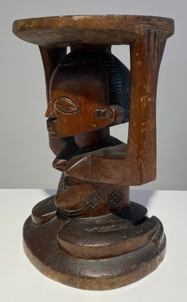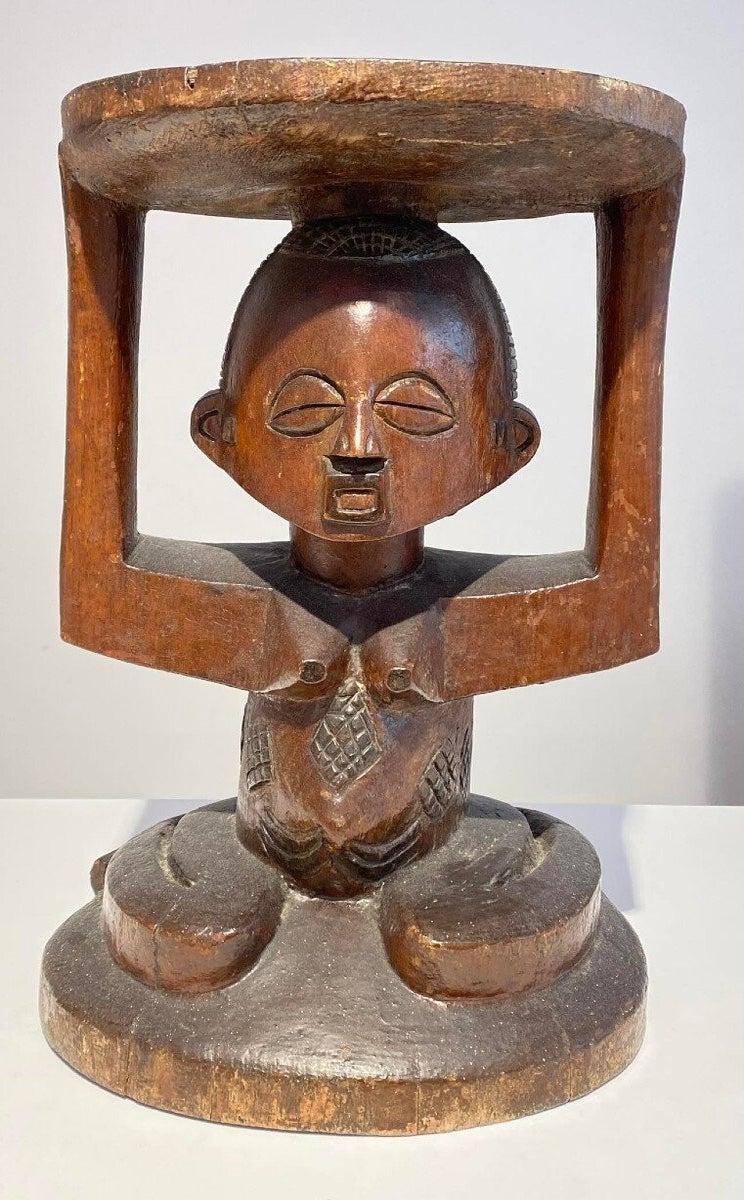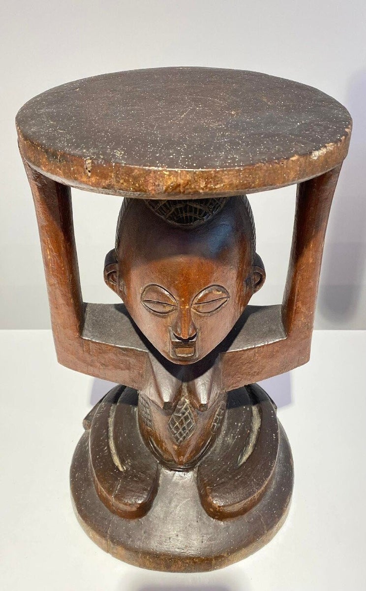 This Luba Royal caryatid stool from DR Congo Luba was in the 19th century used a Royal enthronement emblem. Luba leaders trace their ancestry to a dynasty of sacred kings, and Luba royal seats are intended to replicate an original seat of office owned by the progenitor of this divine lineage. Such works associate their owner with the source of his legitimacy.