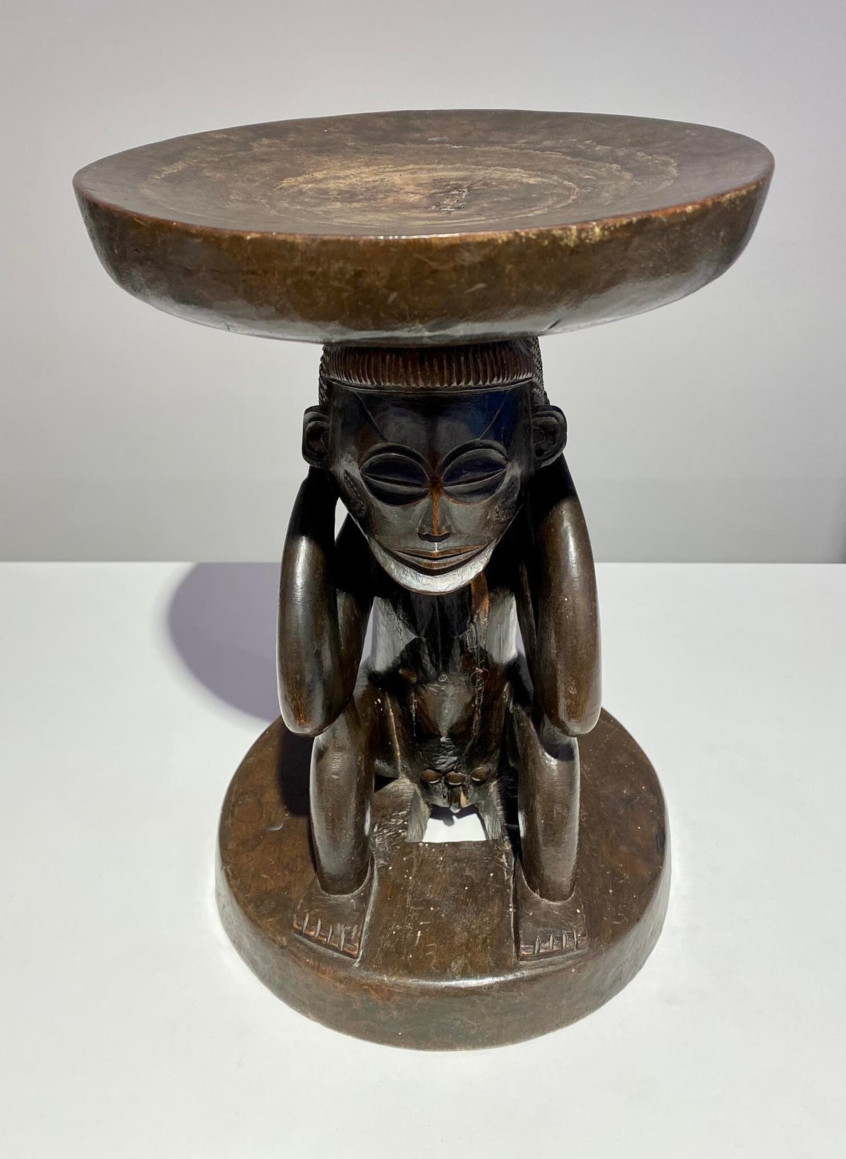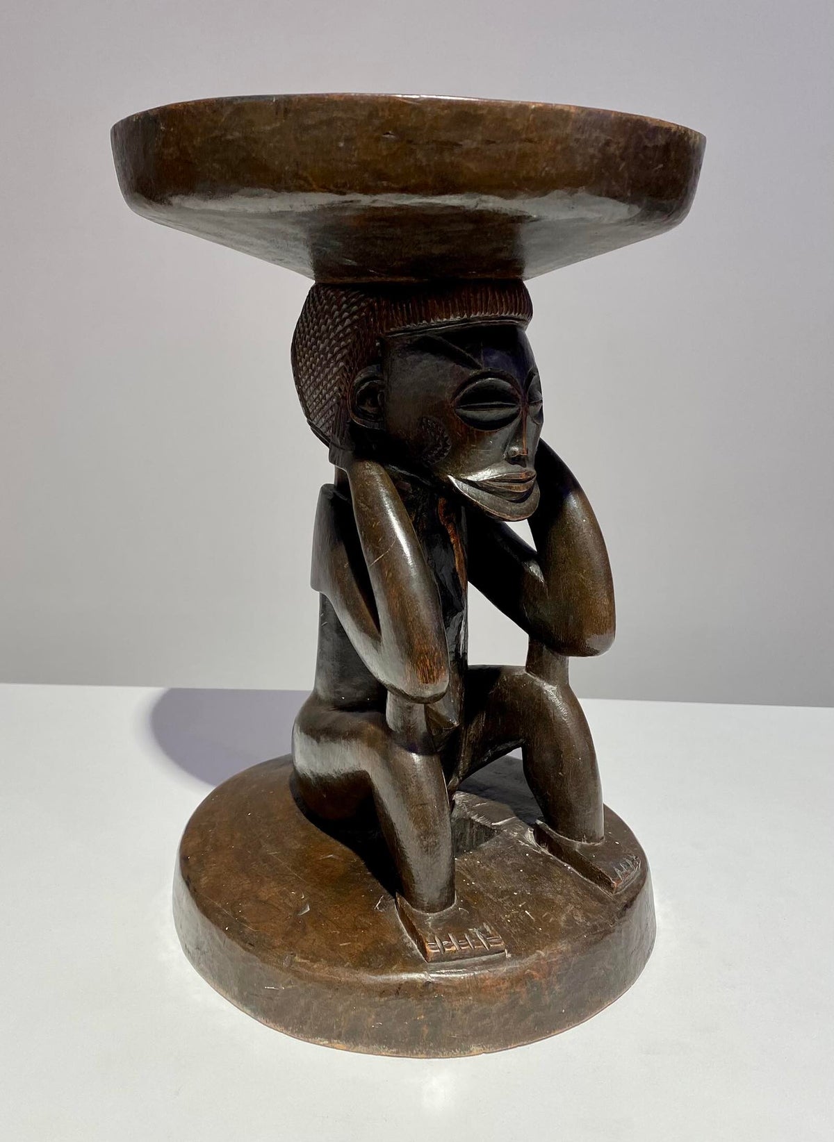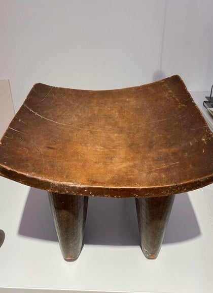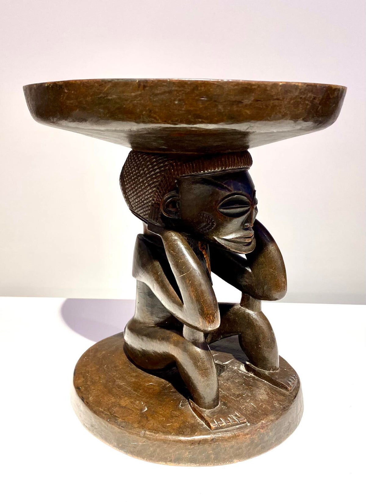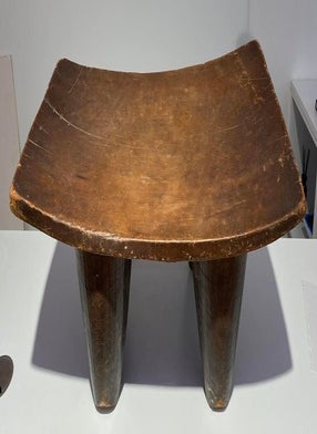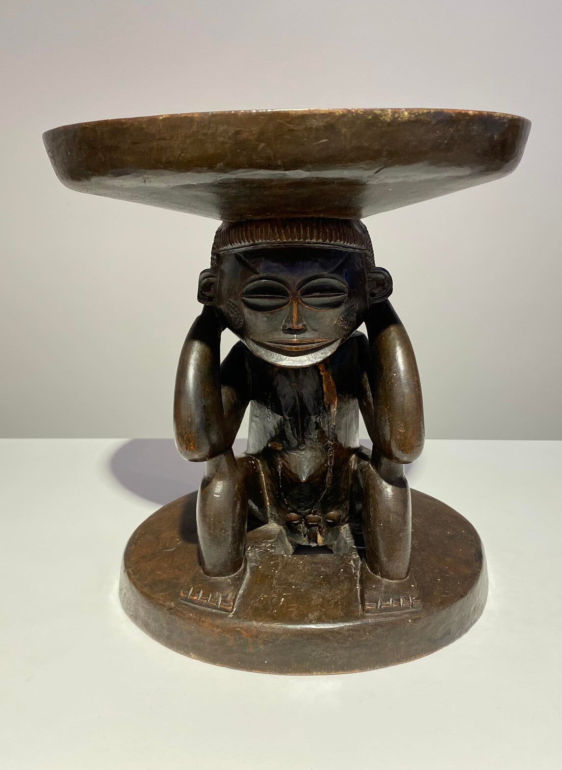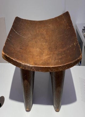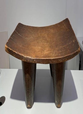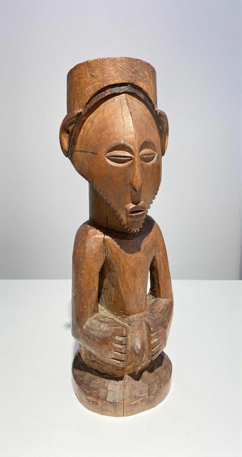 This Luba Royal caryatid stool from DR Congo Luba was in the 19th century used a Royal enthronement emblem. Luba leaders trace their ancestry to a dynasty of sacred kings, and Luba royal seats are intended to replicate an original seat of office owned by the progenitor of this divine lineage. Such works associate their owner with the source of his legitimacy.