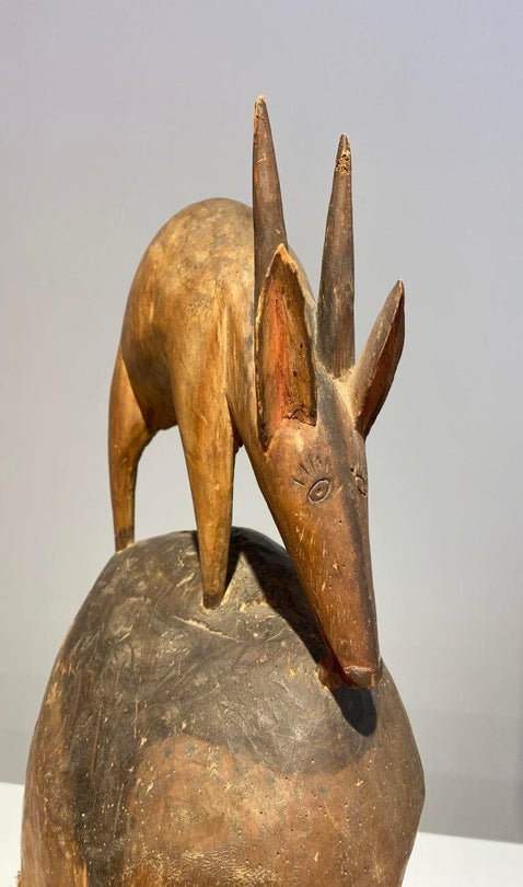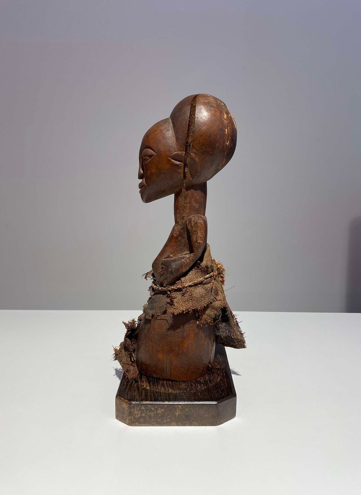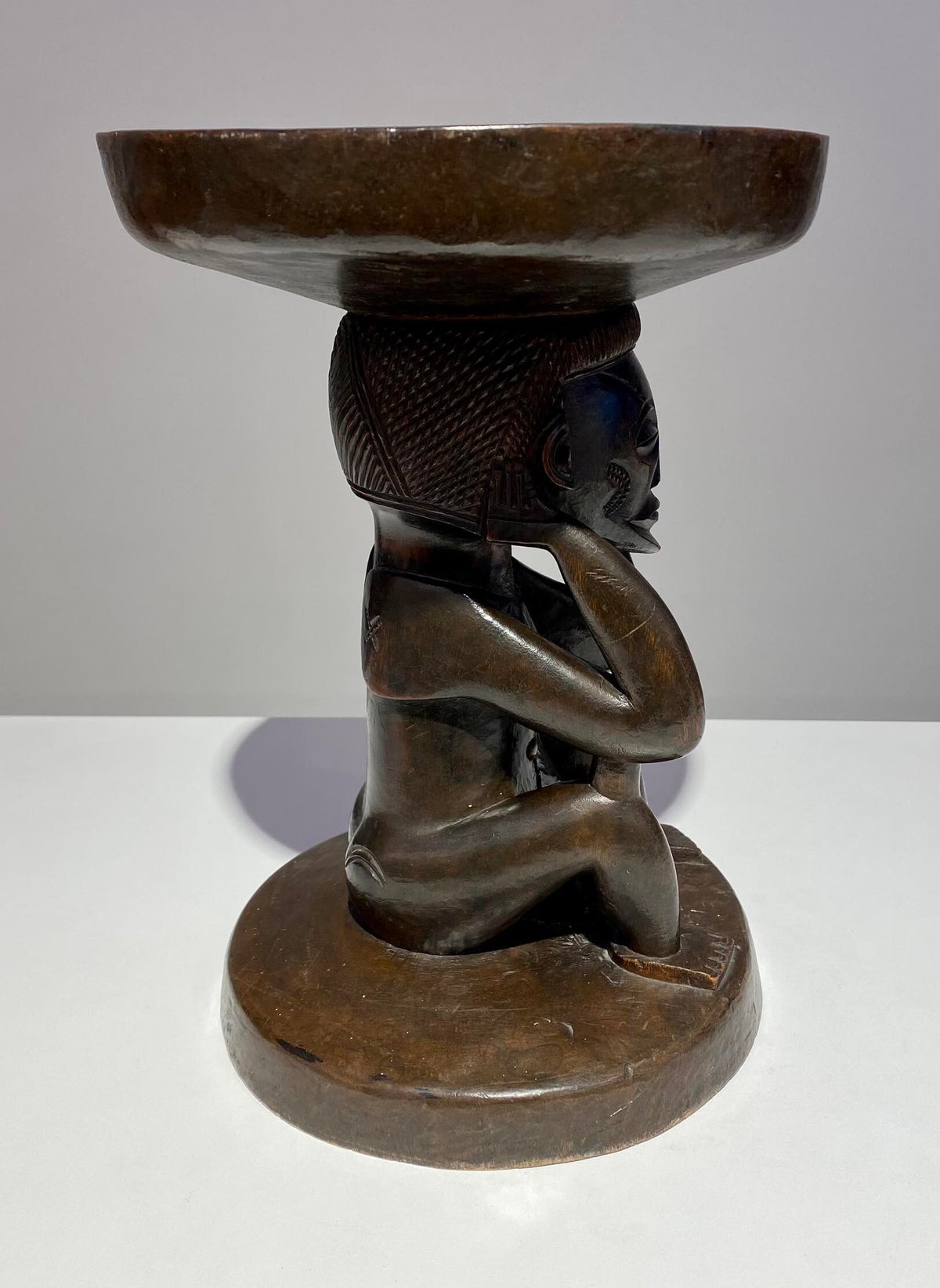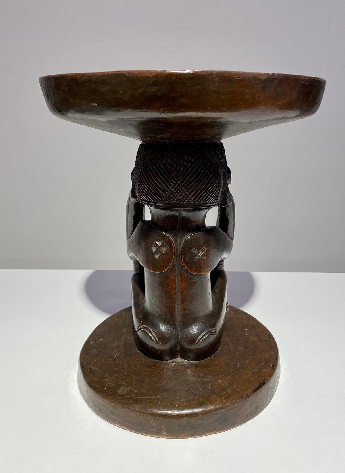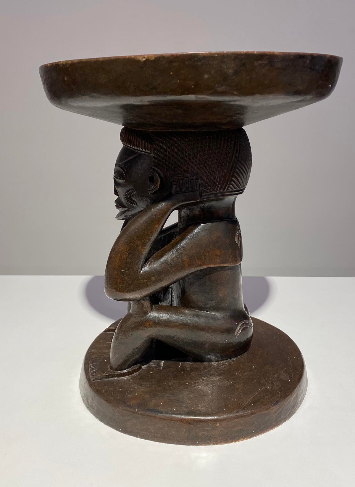 This Luba Royal caryatid stool from DR Congo Luba was in the 19th century used a Royal enthronement emblem. Luba leaders trace their ancestry to a dynasty of sacred kings, and Luba royal seats are intended to replicate an original seat of office owned by the progenitor of this divine lineage. Such works associate their owner with the source of his legitimacy.