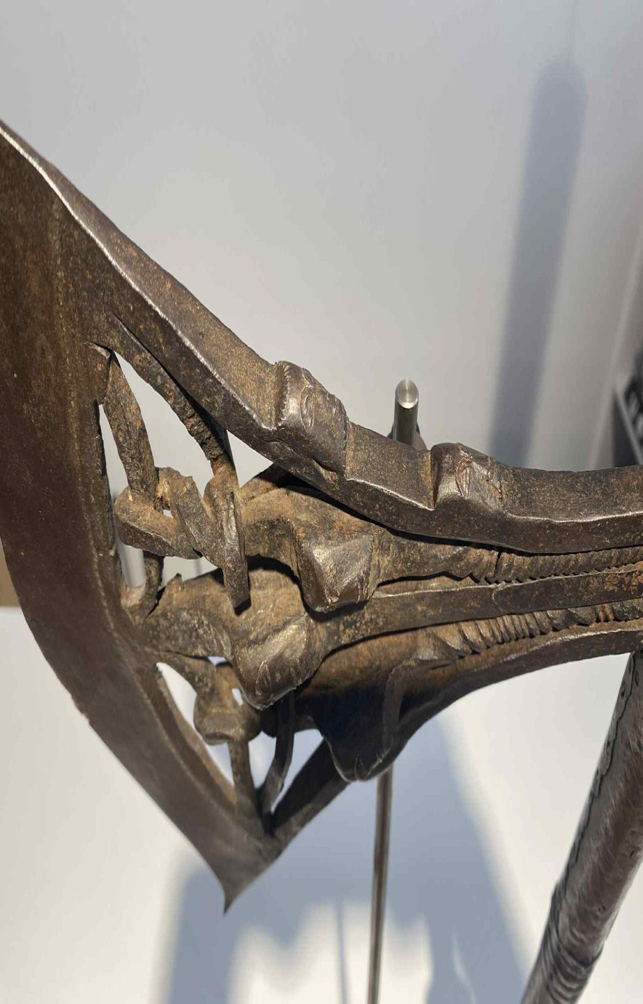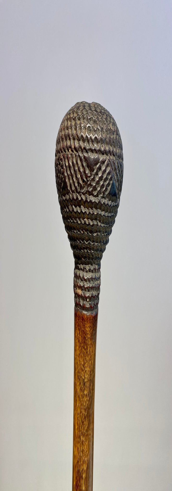 Art historian Suzanne Preston Blier explains that the scepter’s overall shape derives from a genre of throwing-stick weapons introduced to Danhomè in the 17th century under the dynasty’s founder, Huegbadja (reigned c. 1645-1685). A distinctive royal symbol typically adorns such scepters to link them to either the commissioning or commemorated king. This scepter’s finial in a shape of a pineapple connects it to King Agonglo, who reigned from 1789 until 1797. In the Fon language, the word for pineapple is agon, which because of its similarity to the name Agonglo became a pictogram for the ruler’s name. Renowned for his art patronage, Agonglo is credited with developing the artistic tradition of the royal scepters. A century later, Agonglo was established as King Gbehanzin’s sponsoring ancestor and protective spirit (djoto). Gbehanzin ruled from 1889 until 1894 and during this time, commissioned this work to honor his ancestor (Blier 1998).