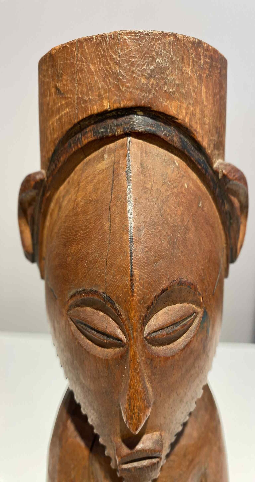 Nicely carved Kusu / Congo statue with beautiful face / almond shaped eyes and triangular face with beard. Top of the head is a big hole to charche the powerful statue and has patina of age and use. This statue, used for worship, represented the ancestor who is being honoured. The Kusu's religious practice was also influenced by its neighbours. All of them share common beliefs; they recognize the Vilie (supreme being), and worship ancestors and various nature spirits. In fact, the Kusu use powerful magical figures similar to those found among the Songye. Kusu societies, with their mysterious past, nevertheless developed workshops based on their own traditions, at the confluence of these diverse and sometimes contradictory influences: they stand out most for "a determinedly ring-shaped technique, polymorphous faces with flat, even concave surfaces, with almond-shaped eyes set close together and touching the base of the nose.