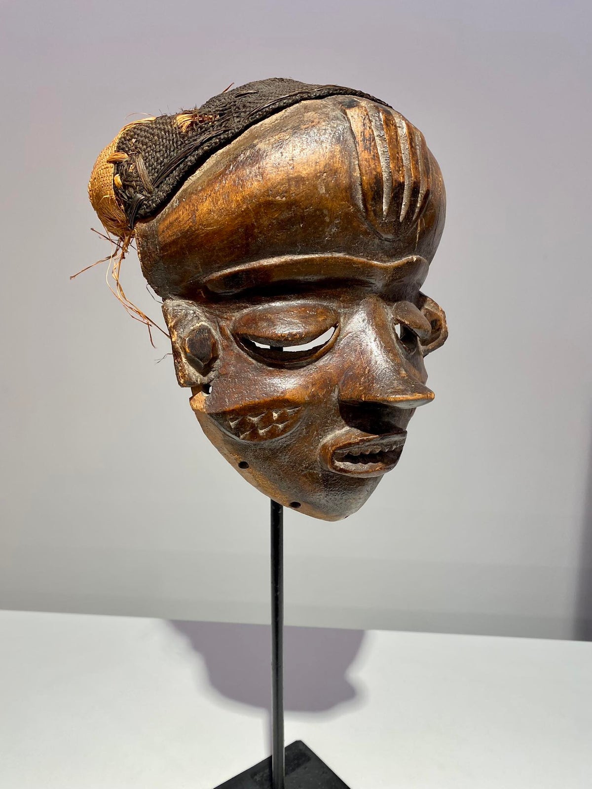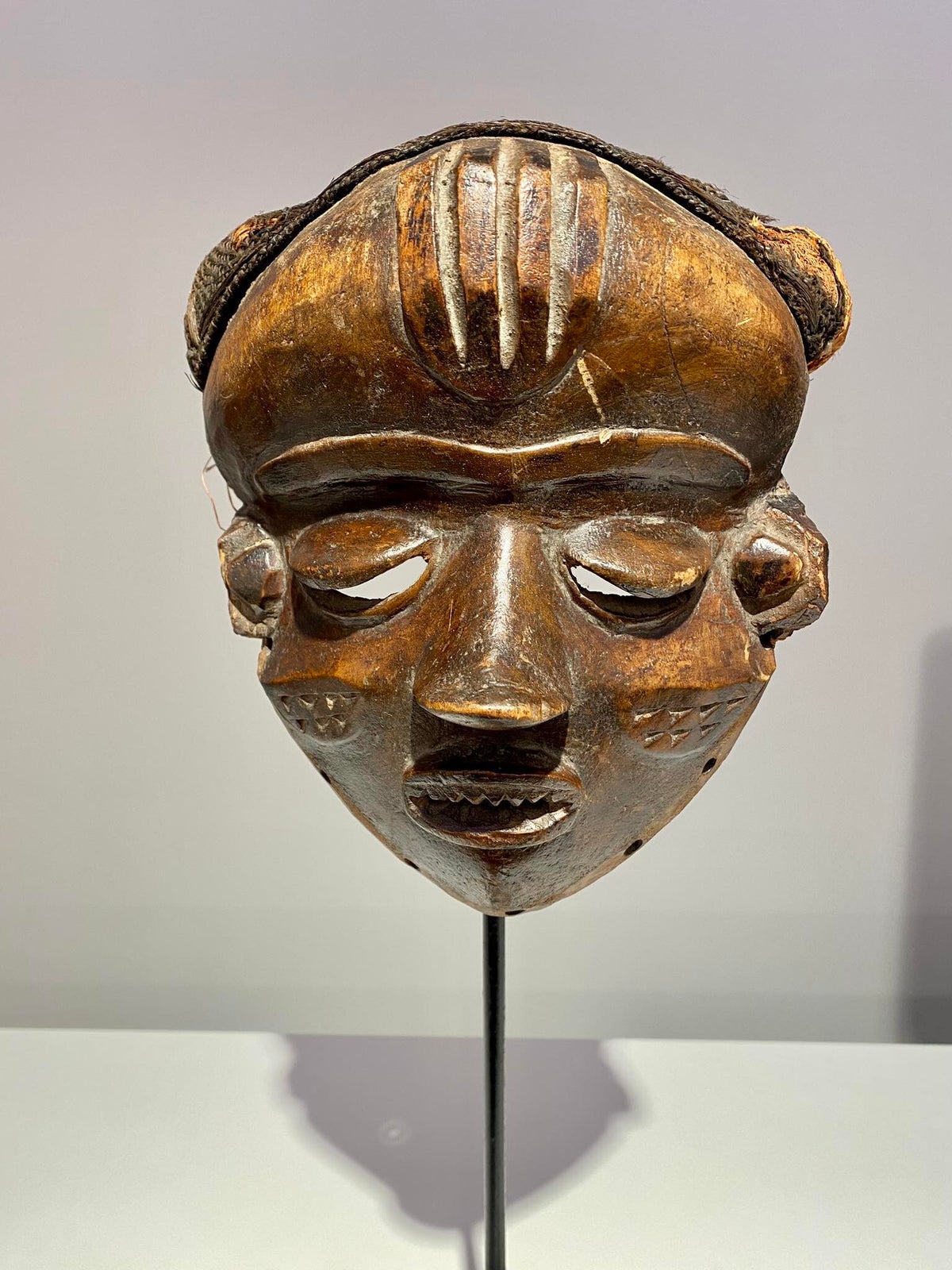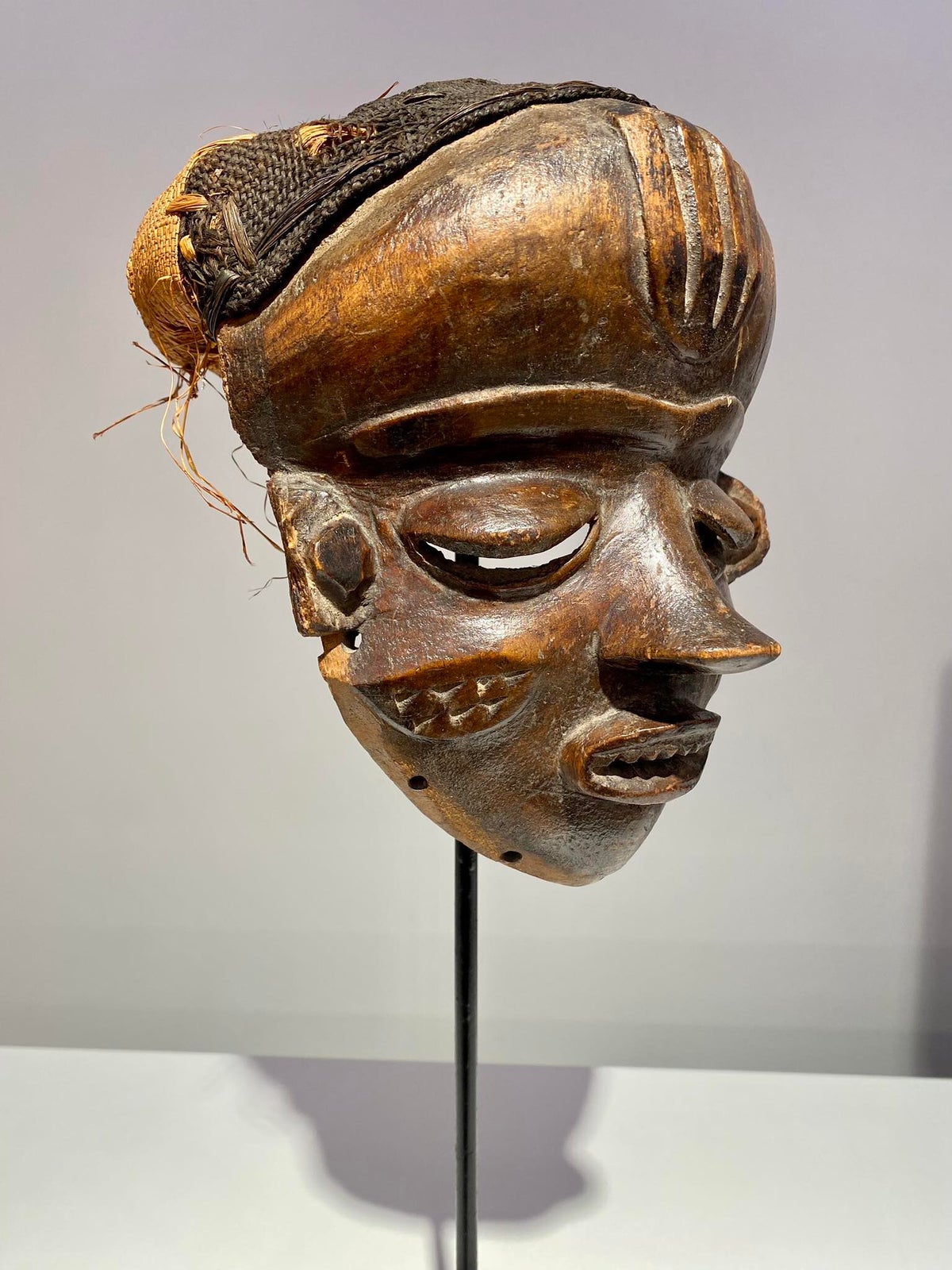 Mwana pwo mask with filed teath. A popular and frequent occurrence in entertainment masquerades, mwana pwo represents a female ancestor but is always worn by a male dancer. This mask type symbolizes fecundity and the prominent role of women in Chokwe society. Although idealized, its features suggest the individuality of a portrait, raising the possibility that it may be modeled on a particular woman. Mwana pwo often features elements of beauty such as scarification and hairstyles.