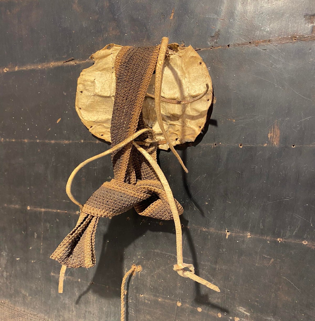 This type of shield is found in many african ethnic groups, whether Bantu or not. It is called nguba, guba, wara or gele according to these tribes. It is made up of several layers of braided fibers and an oval piece of wood serves as a handle. This basketry work was traditionally reserved for men, except in the Ngiri and Poto where women could exercise it. The name Nguba comes from the proto-bantu gùbà word which means «shield». The Obambas sometimes used animal skin to make them.
