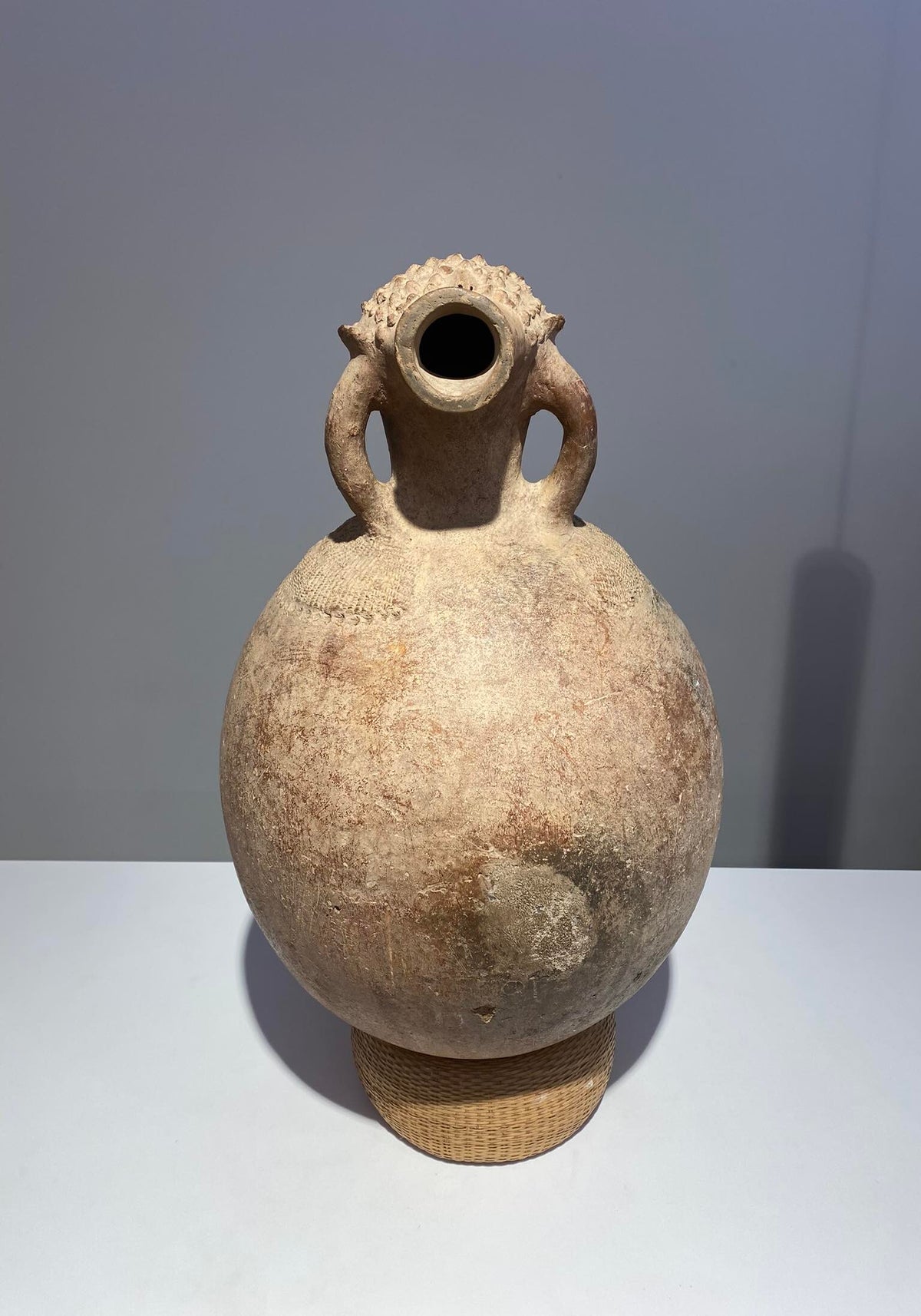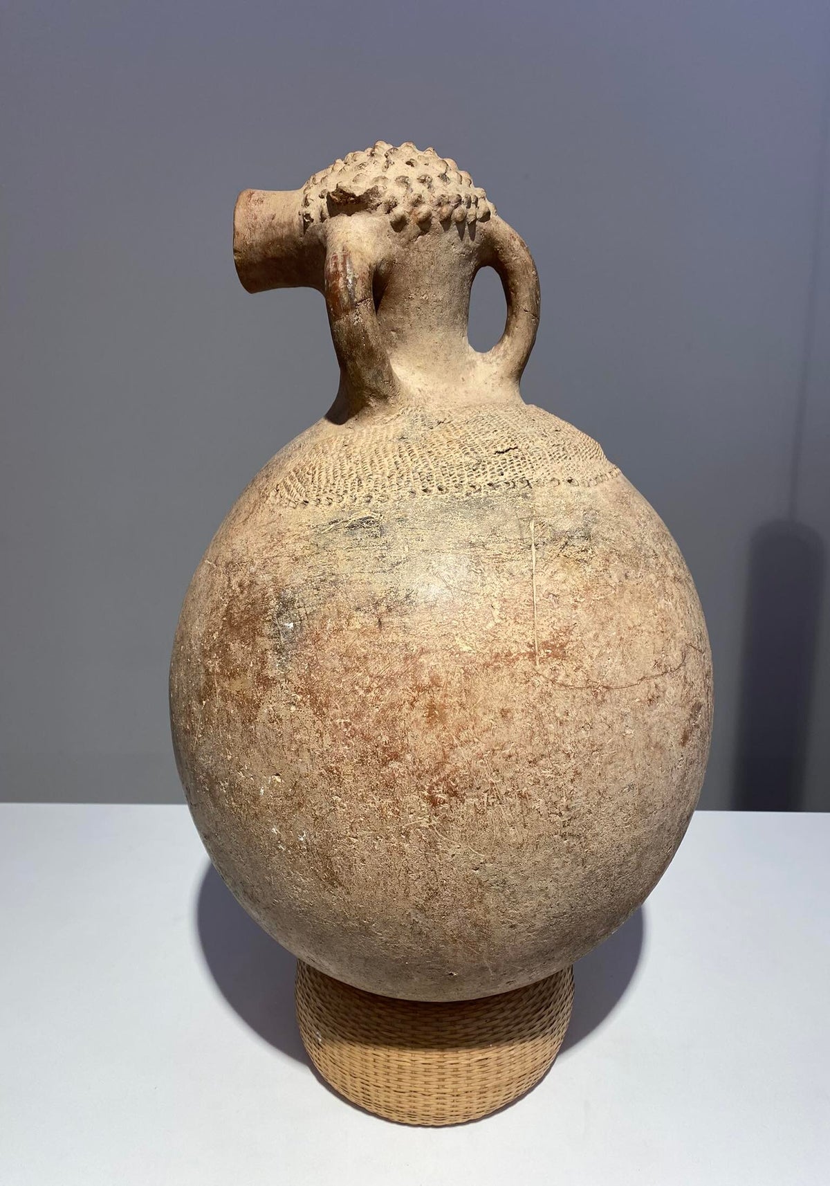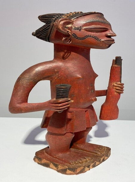 This work was commissioned during the unprecedented economic and artistic growth of the late nineteenth or earlier twentieth century Kuba kingdom. It closely resembles the figurative drinking vessels that Kuba elites—particularly men—used to drink palm wine (maan), a sweetly sour alcoholic beverage.