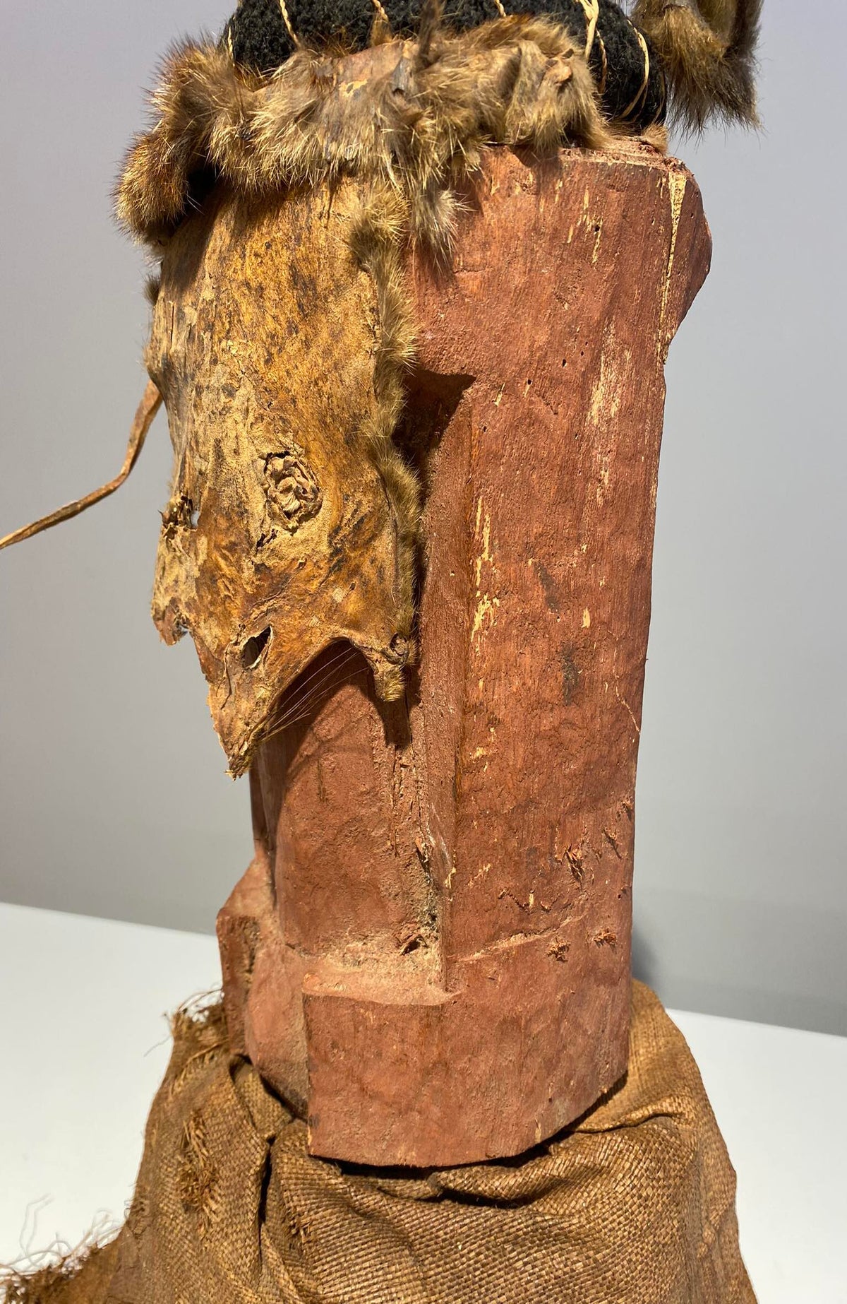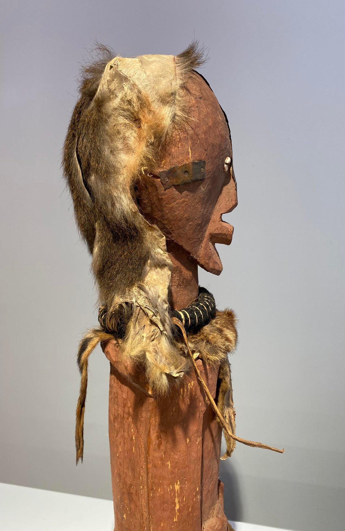 Wooden mask with traces of red occre/pigments.