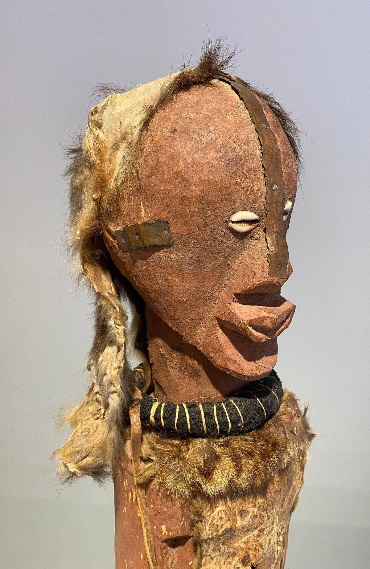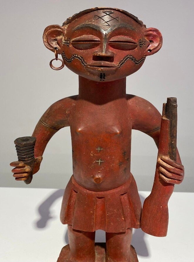 A very powerful well carved nkishi statue from the Songye or Tetela people. Statues like these were used as protection and even were used on battle fields. The red occre colour could suggest this statue served even on the battle fields.