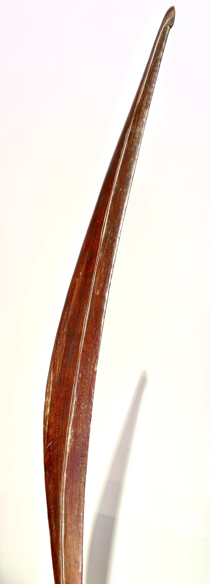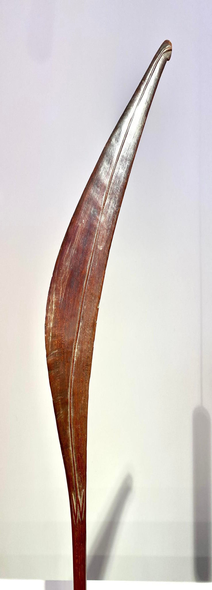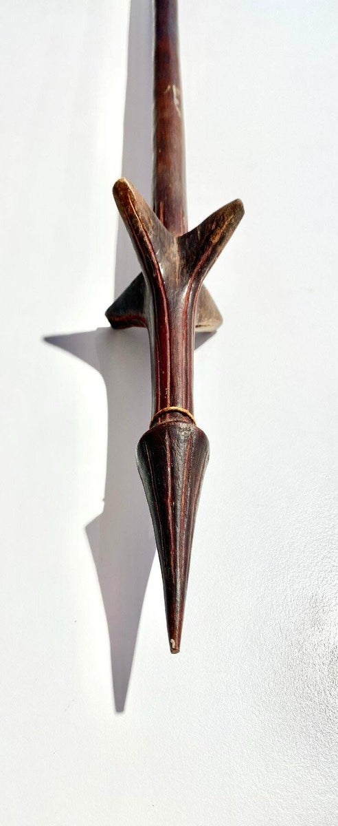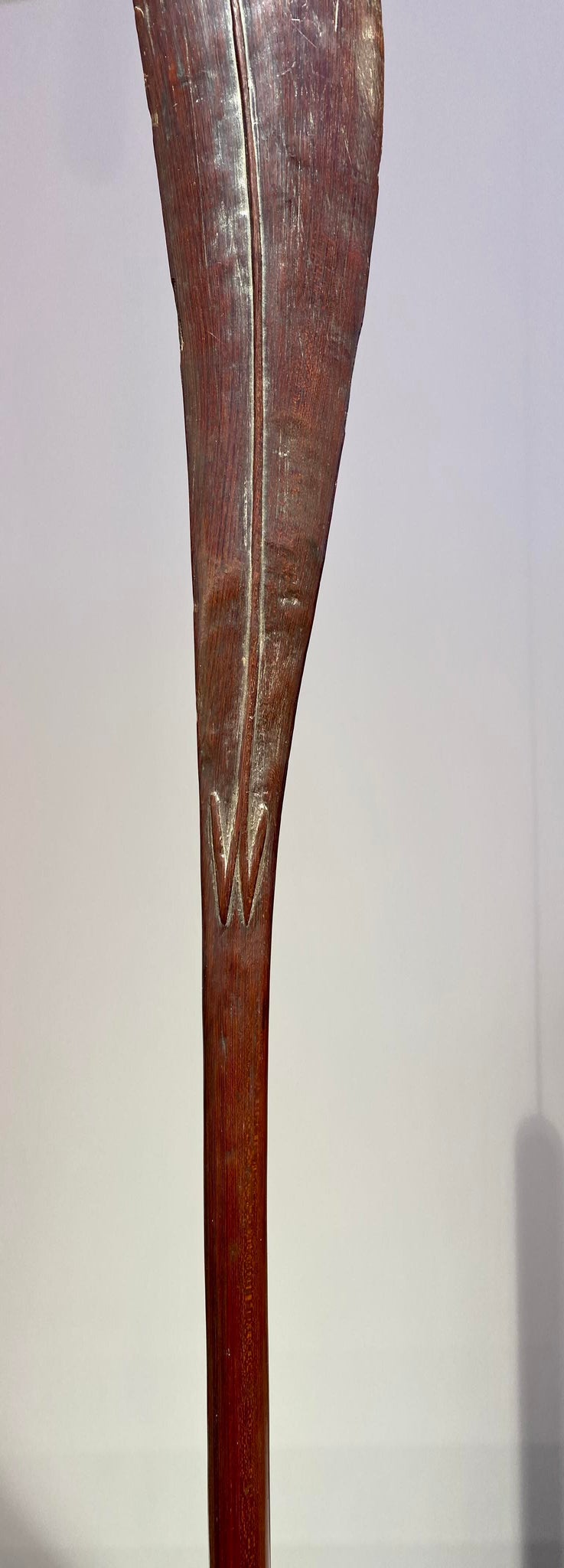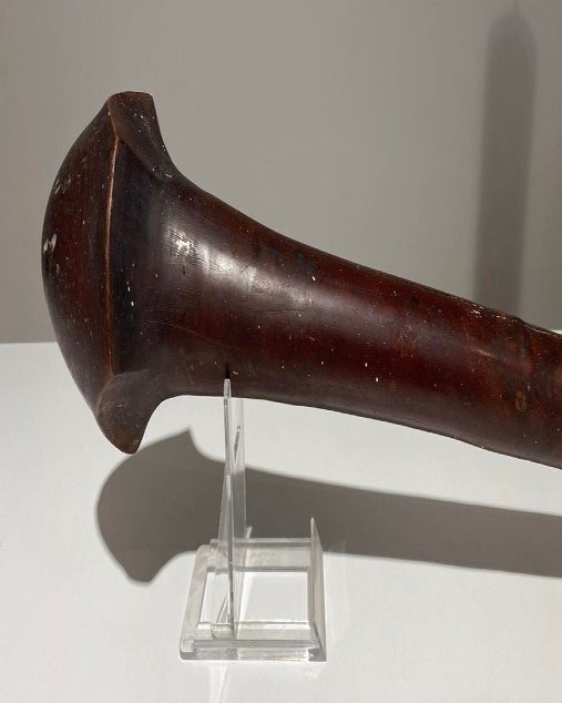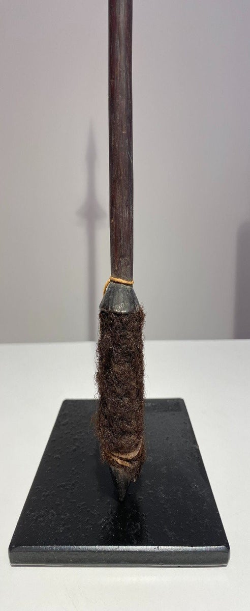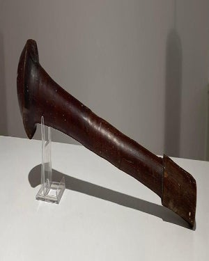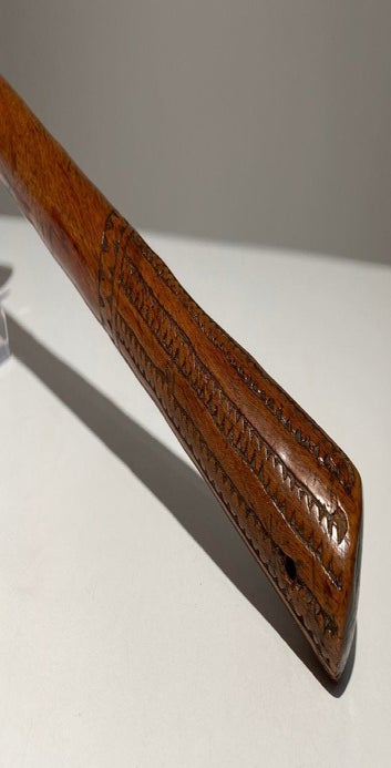 It was used to deflect the enemy’s arrows and spears. It has a leaf-shaped head. This particular club has a beautiful patina due to age and use.