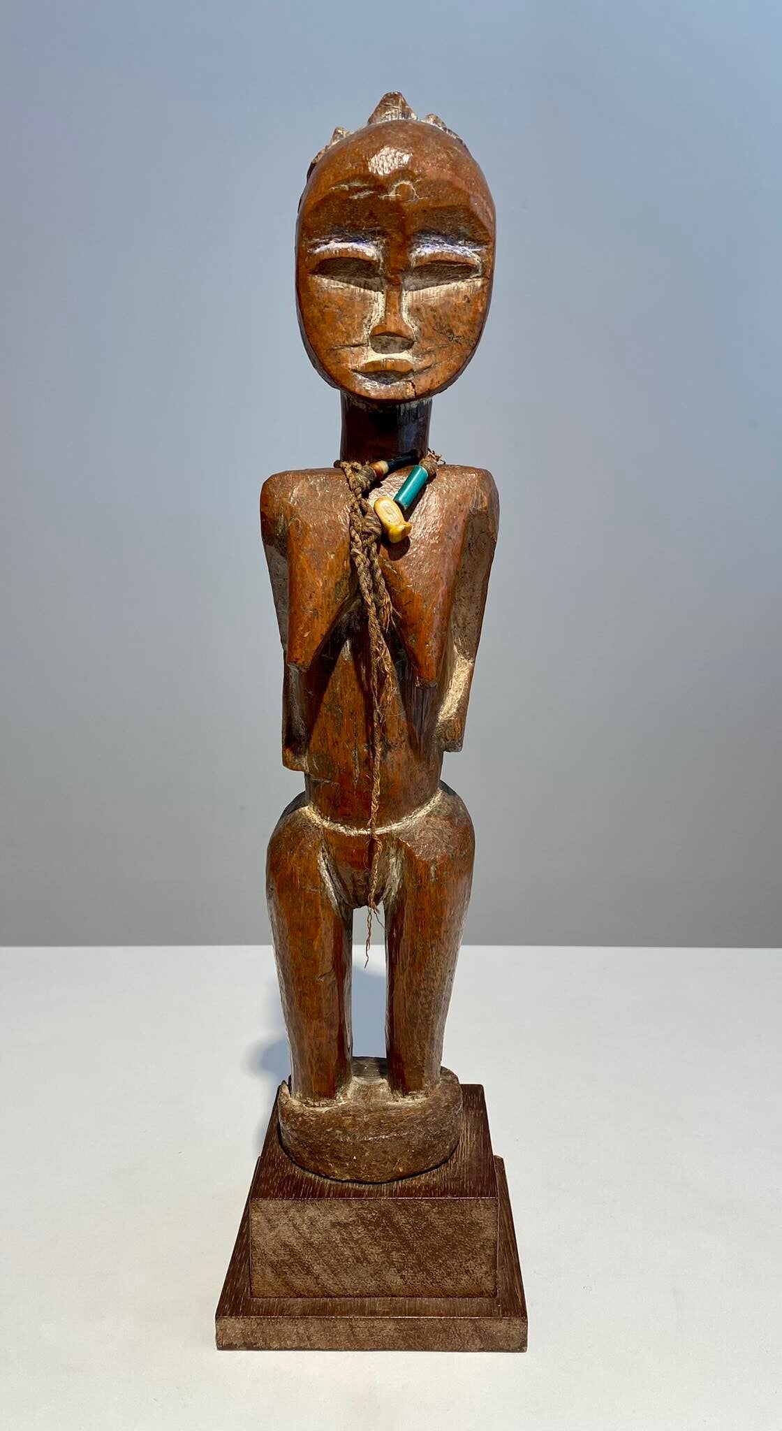 Rare female wooden statue from the Kulango tribe located in Ivory Coast. The Kulango people are located near the border with Ghana in Africa. The Kulango are matrilinear. They believe in a supreme god who is not worshipped but is addressed in association with "mother earth." The earth god, Tano, is a god of the whole tribe.