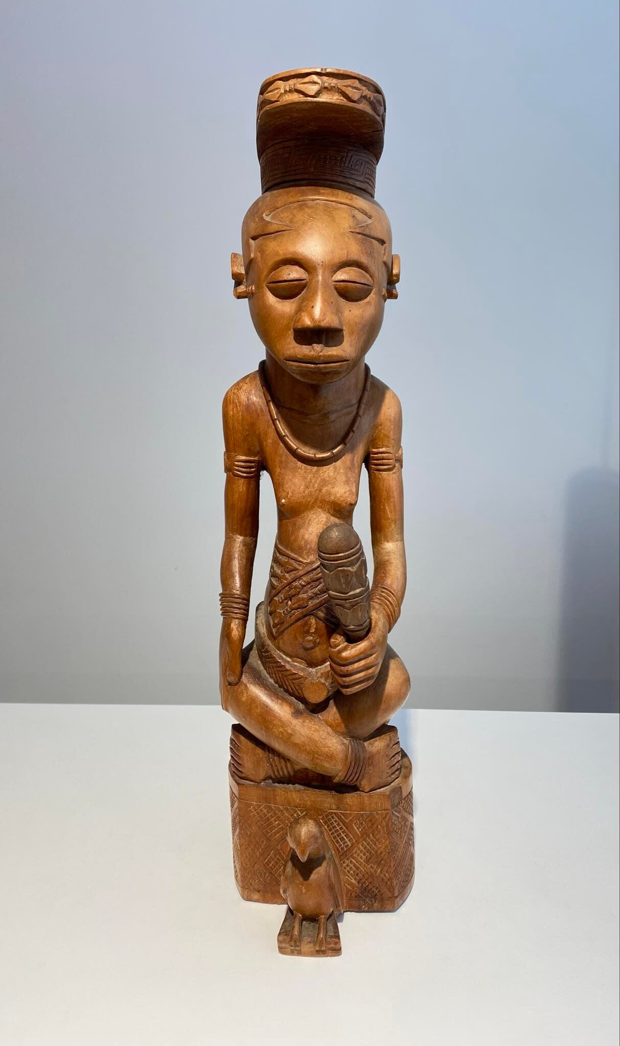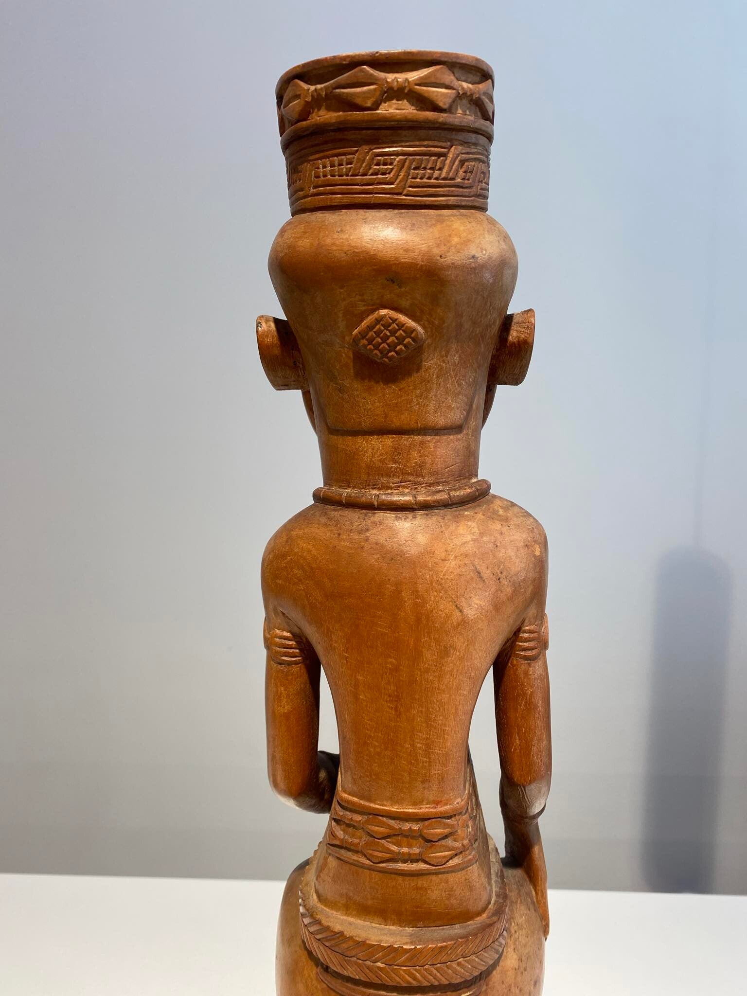 Although the sculptural genre appears naturalistic, ndop are not actual one-to-one representations of particular subjects, but rather a culmination of visual notations that represented the ideal characteristics of the deceased king. The reign of individual rulers are identified by a small emblem, called an ibol, at the base of the sculpture. Each ibol is rendered with a great degree of customization and personalization in an otherwise formal and naturalistic standardization. Measuring about 48-55 centimeters in height, ndop were carved in hardwood and anointed with palm oil to protect them from insects, which is unique in African art and underscores their survival in Western collections today. Ndop sculptures depict subjects sitting cross-legged, a posture that is equally unique in African sculpture.